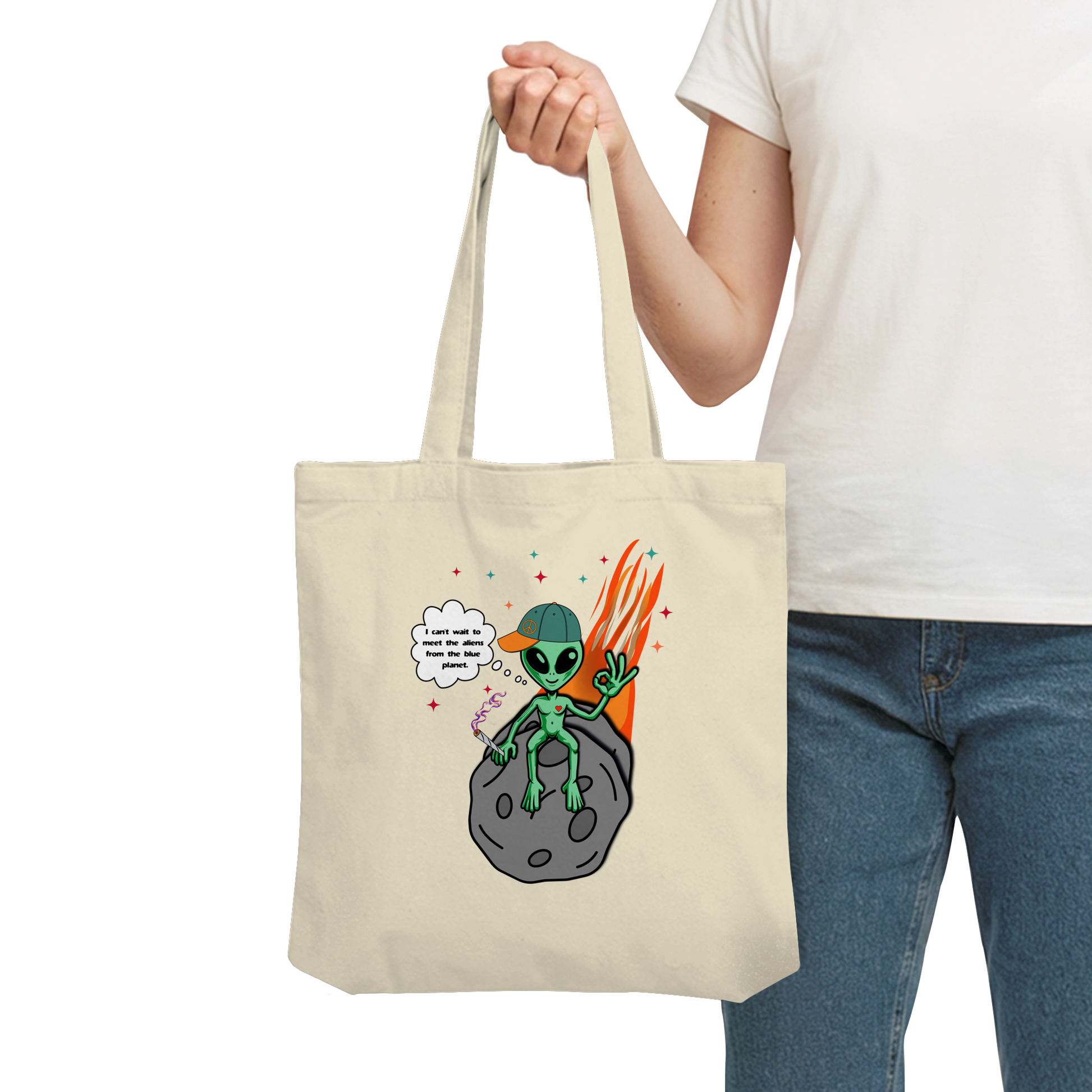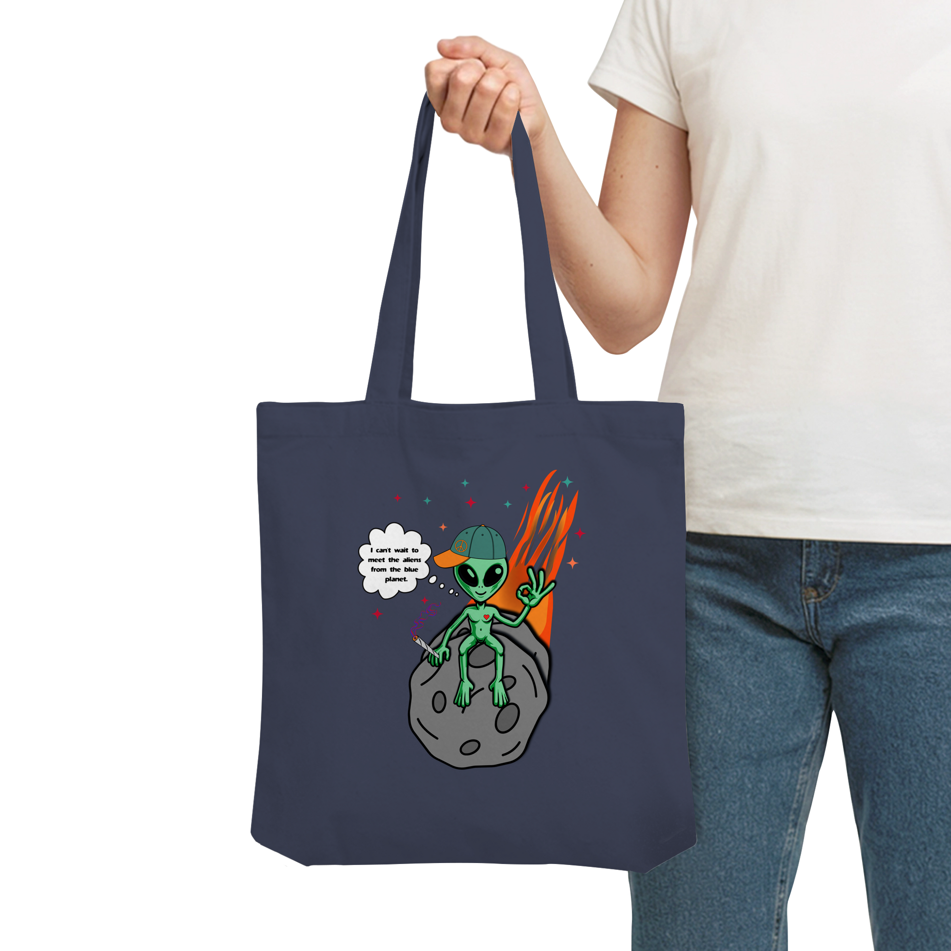 An alien on a collision course: With a healthy dose of dark humor and the slogan "I can't wait to meet the aliens from the blue planet," this tote bag becomes an absolute conversation starter every time you go shopping.