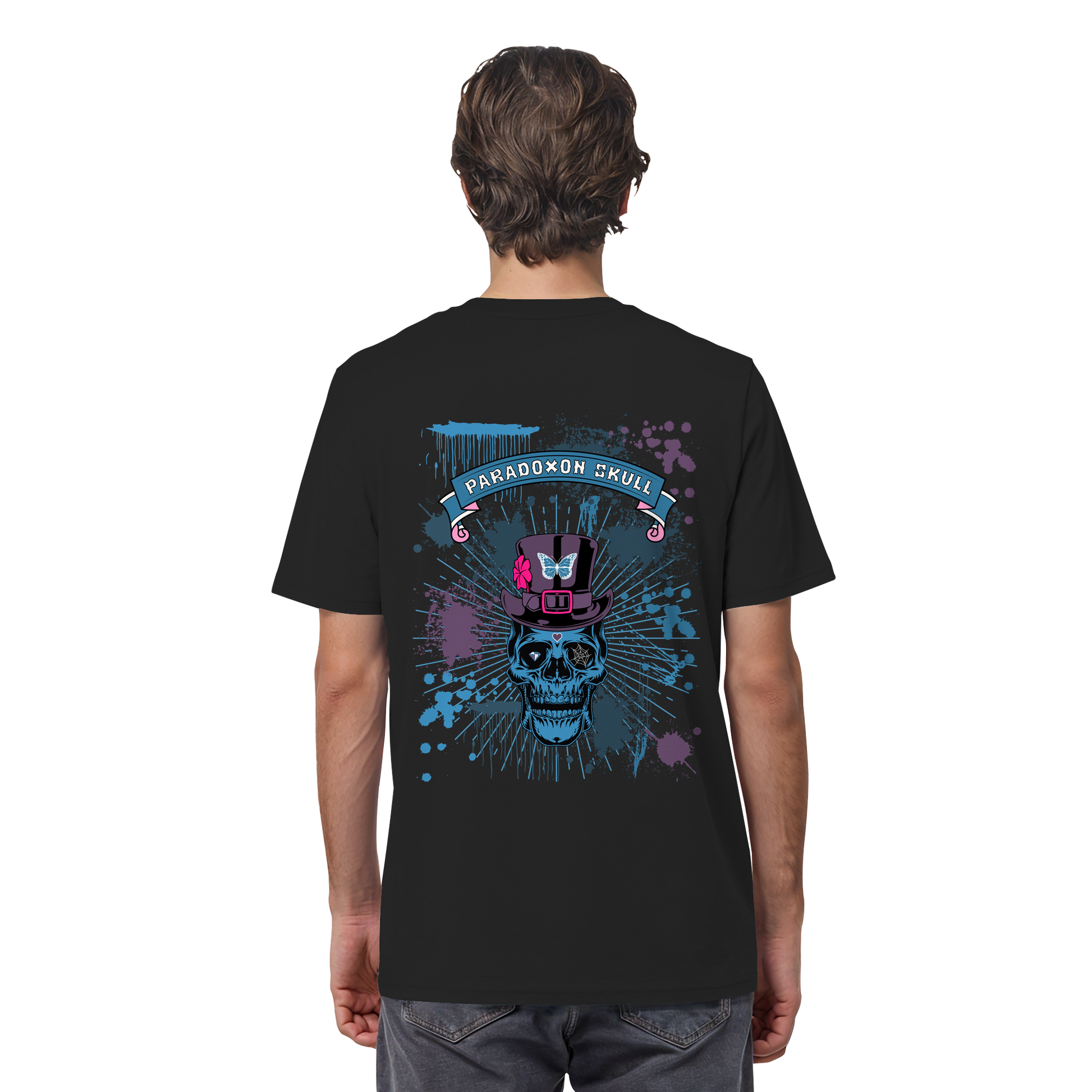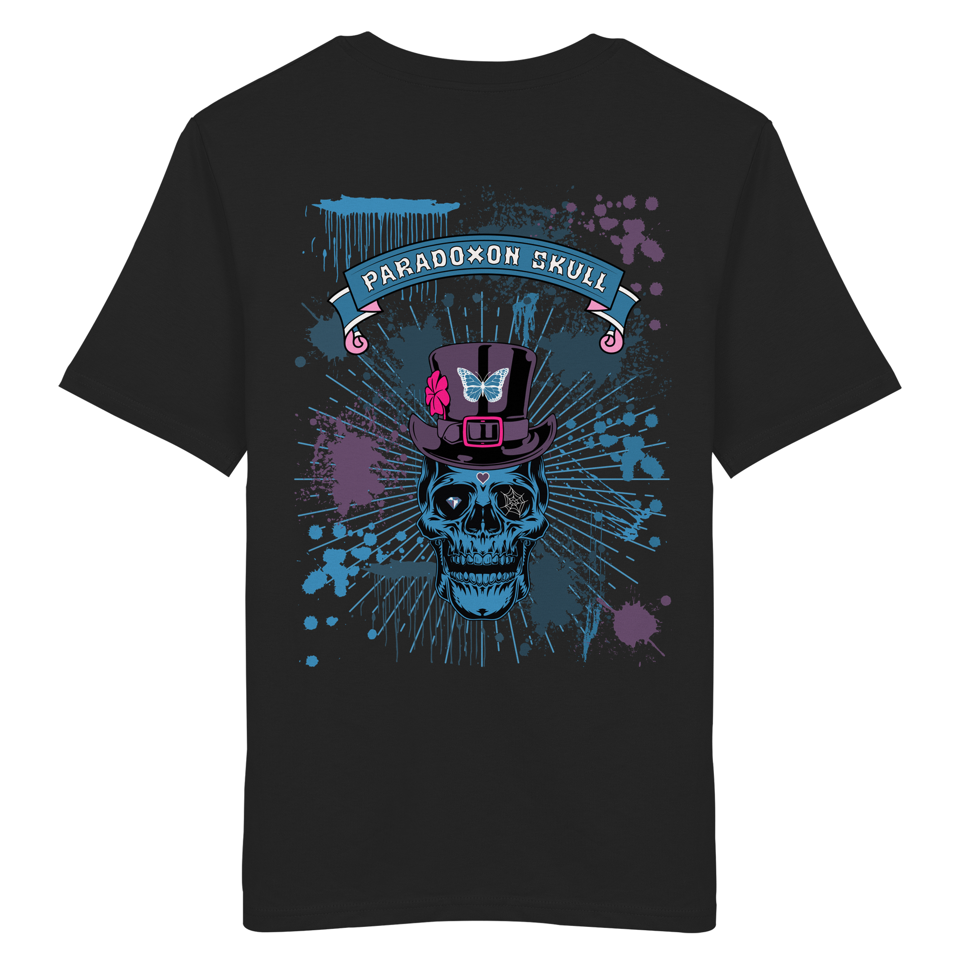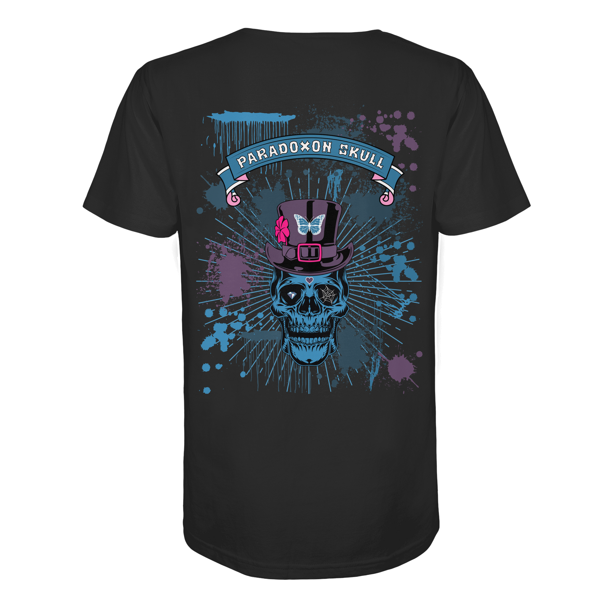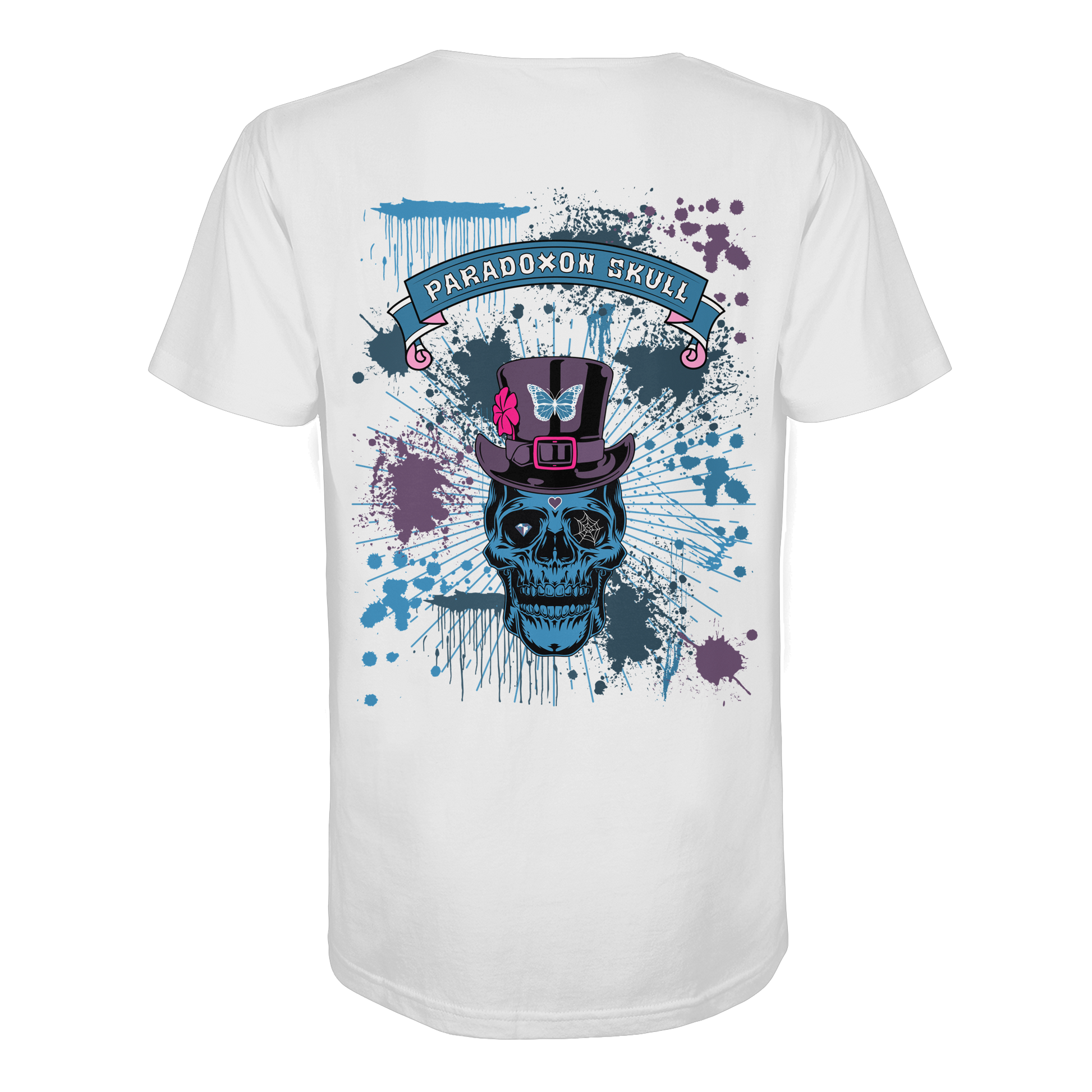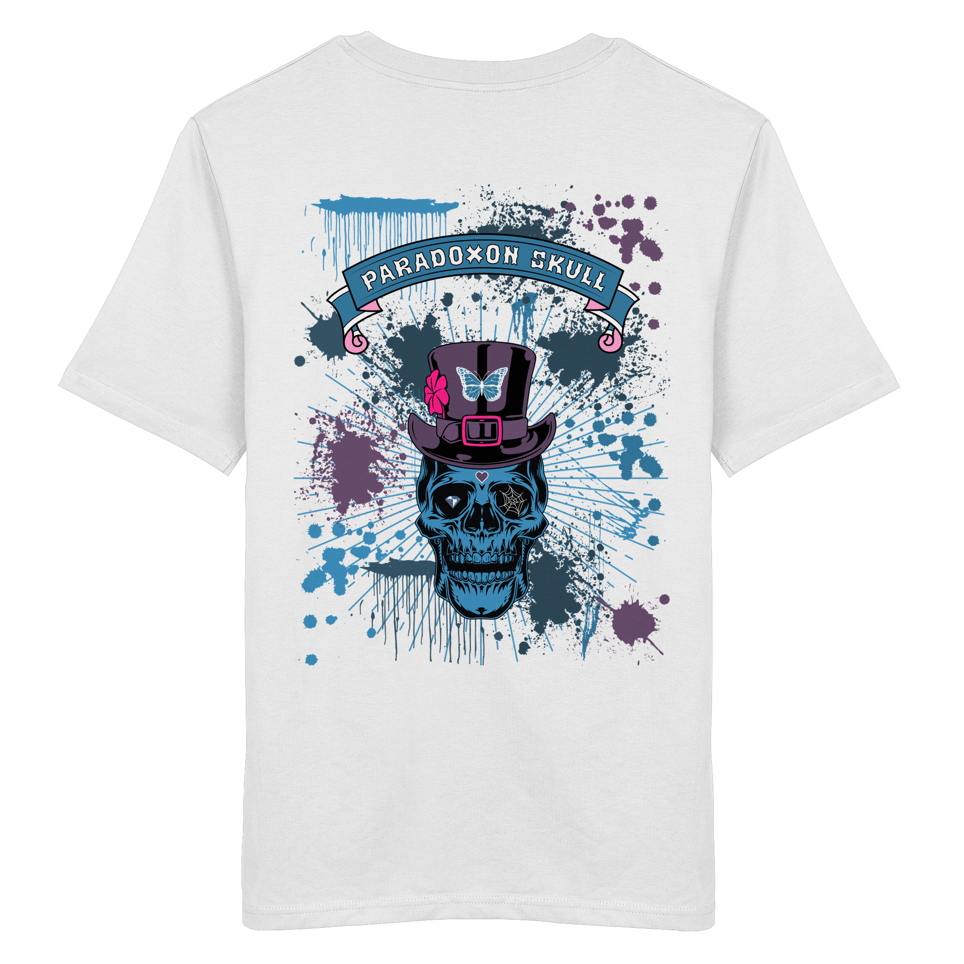 Das Leben zeigt sich als ein widersprüchliches Zusammenspiel von Vergänglichkeit und Schönheit, dargestellt durch den Totenkopf mit Zylinderhut und Schmetterling. Das Kleeblatt symbolisiert Hoffnung, der Diamant im rechten Auge steht für Reinheit, und das Spinnennetz im linken Auge verkörpert Komplexität. Das Herz auf der Stirn erinnert an die Liebe und Leidenschaft, die das Leben ausmachen.