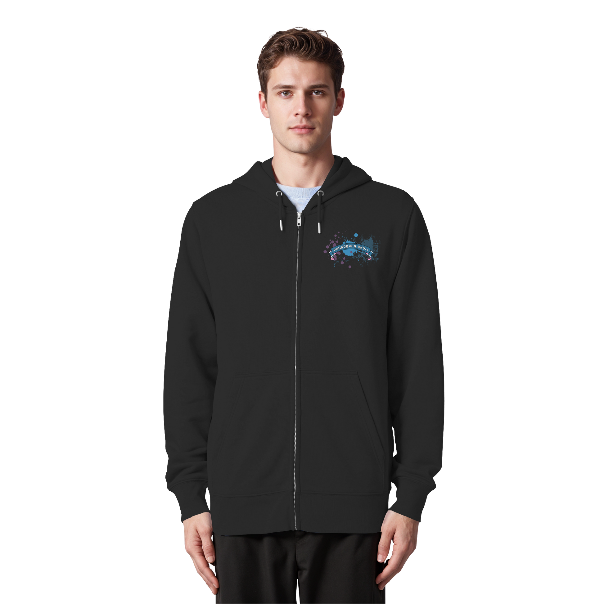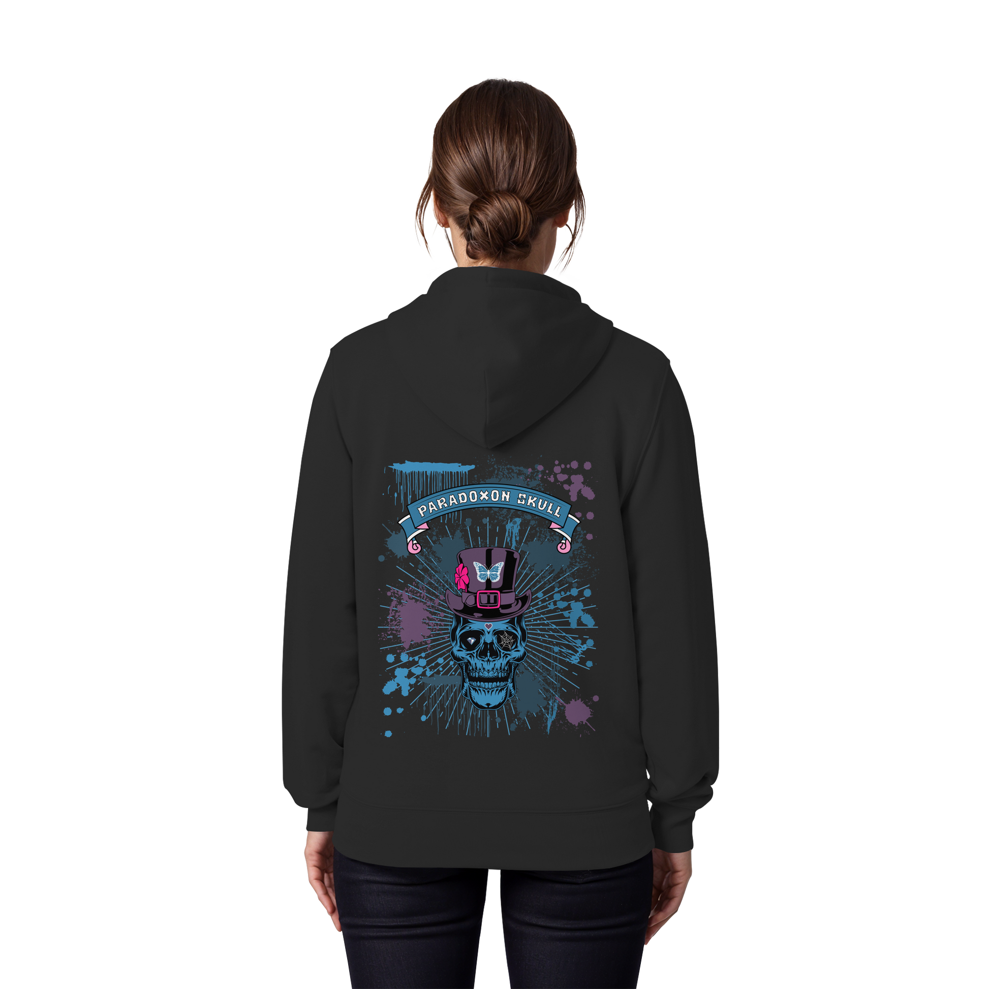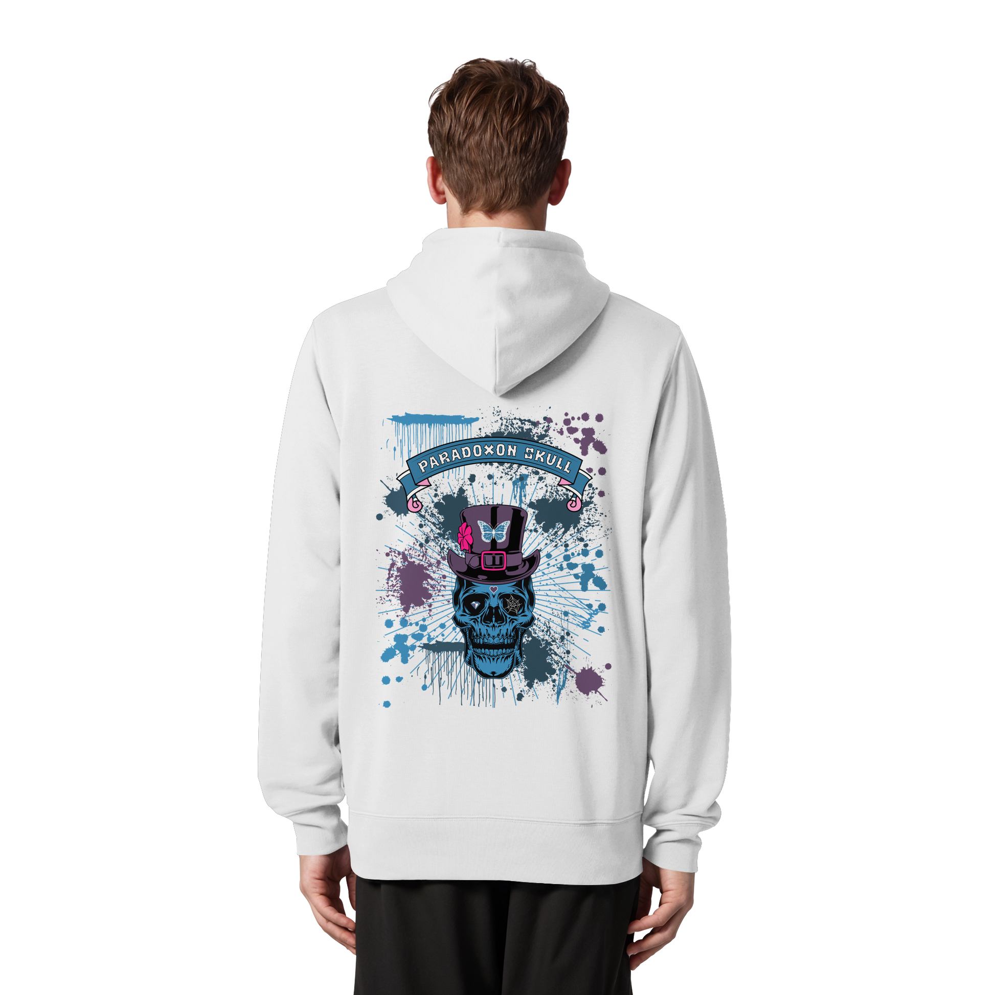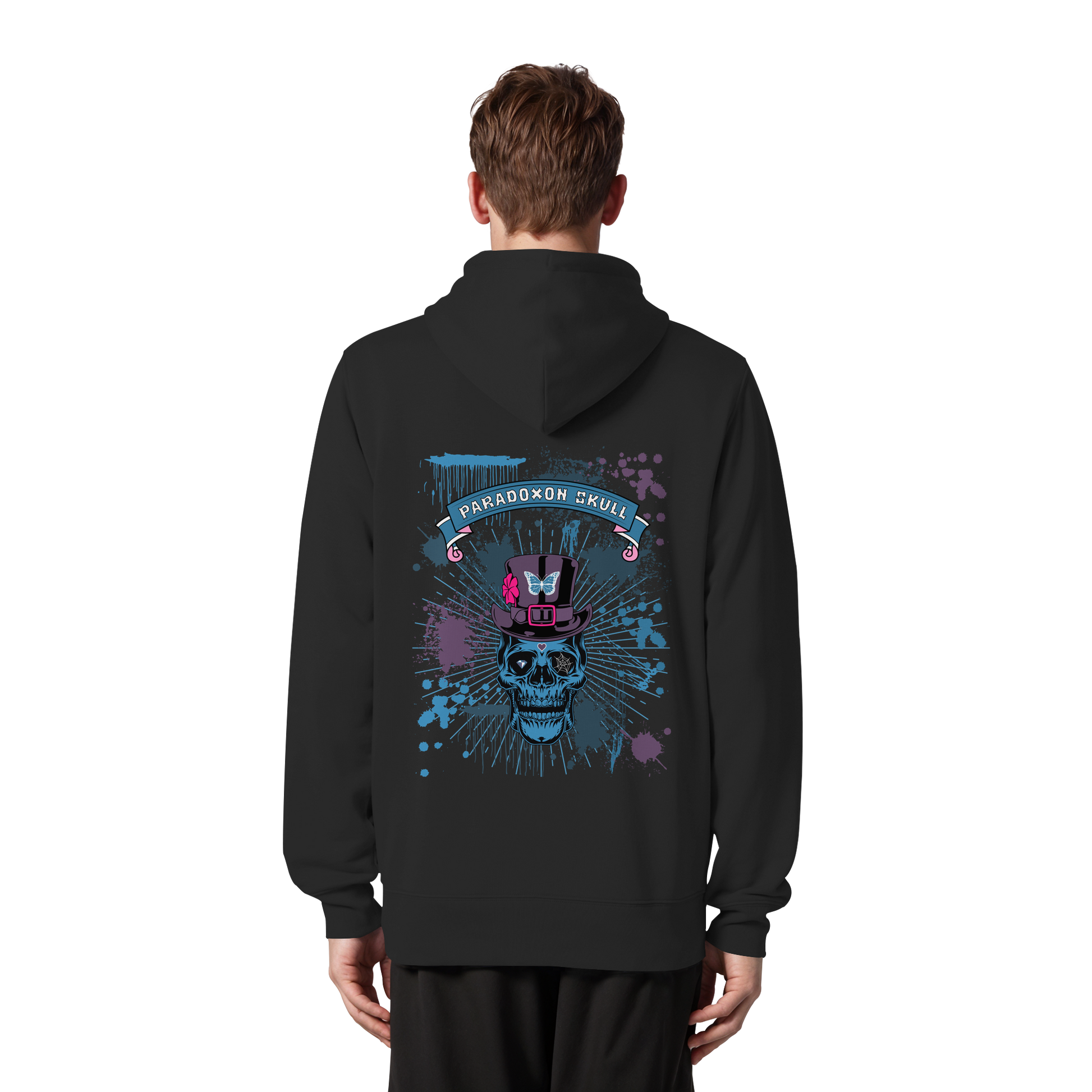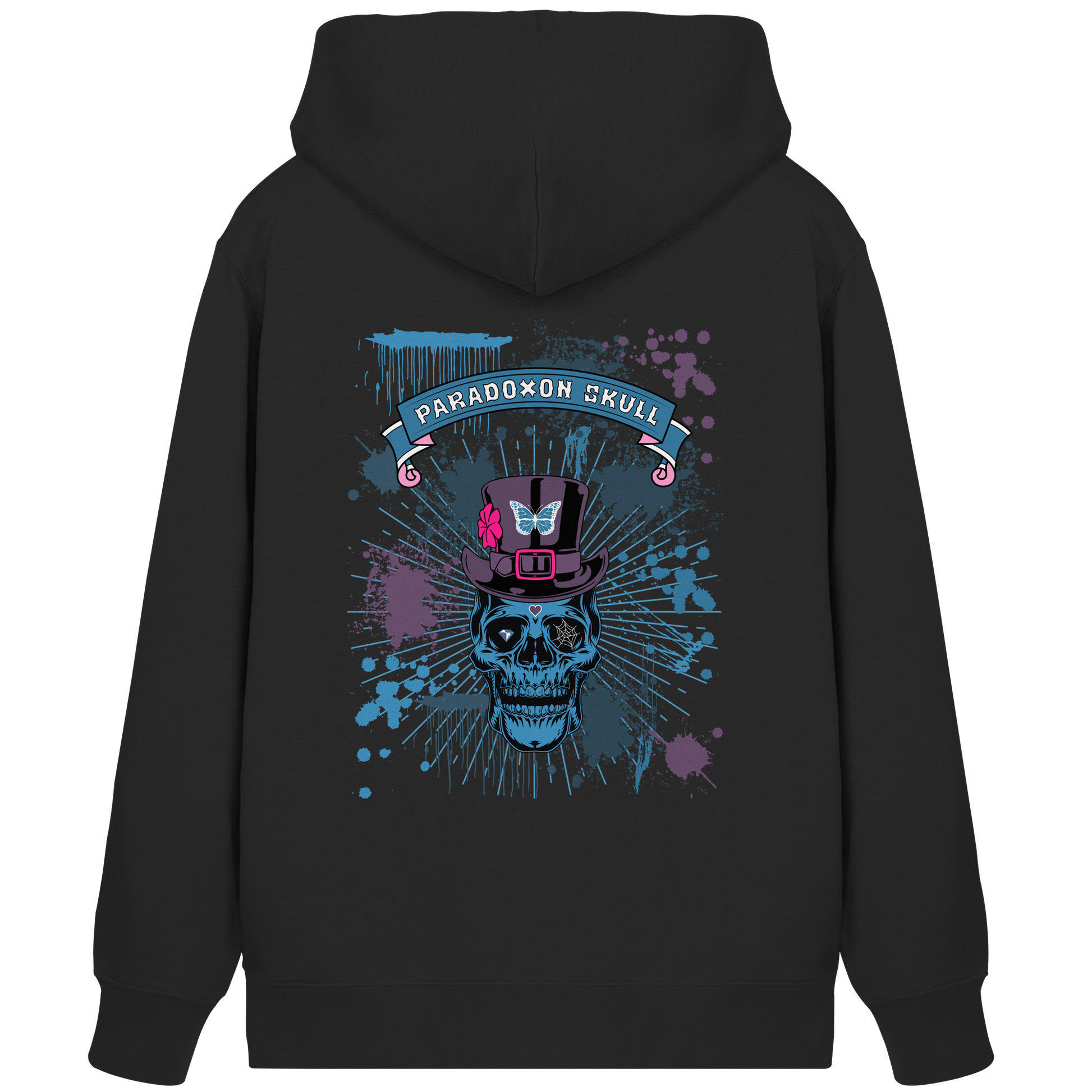 Das Leben zeigt sich als ein widersprüchliches Zusammenspiel von Vergänglichkeit und Schönheit, dargestellt durch den Totenkopf mit Zylinderhut und Schmetterling. Das Kleeblatt symbolisiert Hoffnung, der Diamant im rechten Auge steht für Reinheit, und das Spinnennetz im linken Auge verkörpert Komplexität. Das Herz auf der Stirn erinnert an die Liebe und Leidenschaft, die das Leben ausmachen.