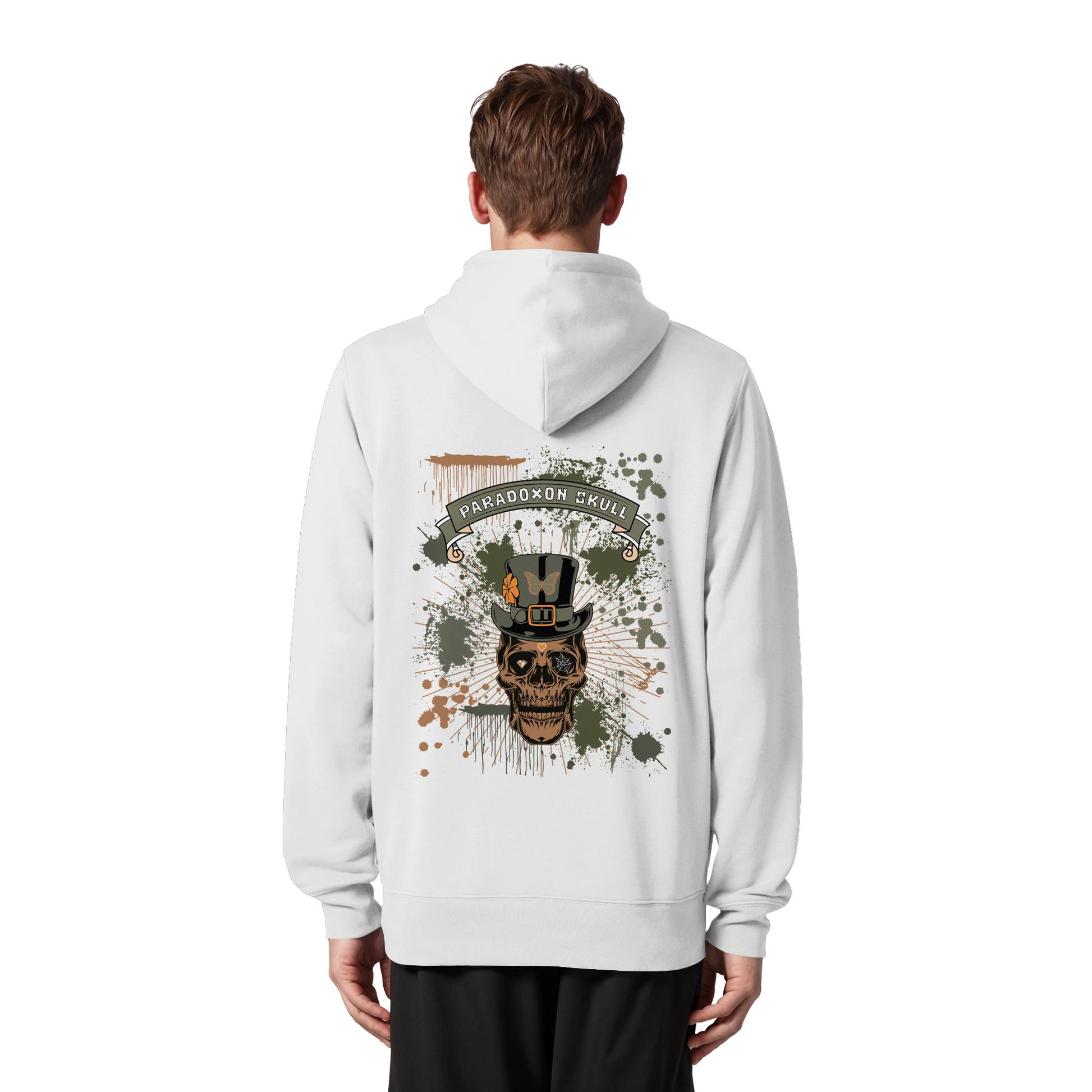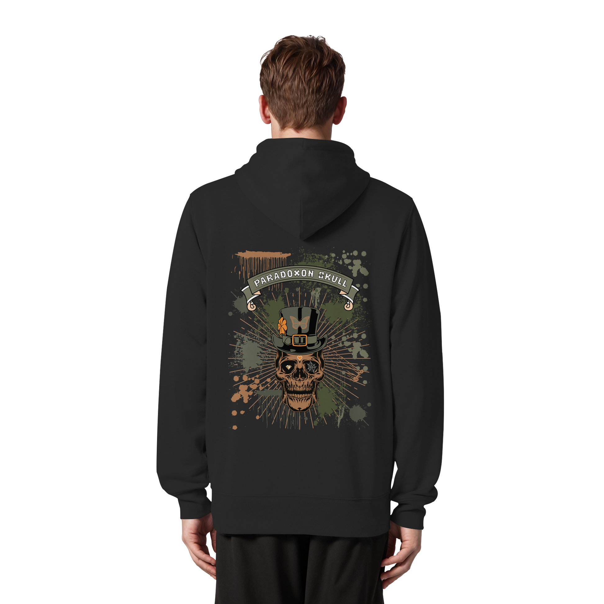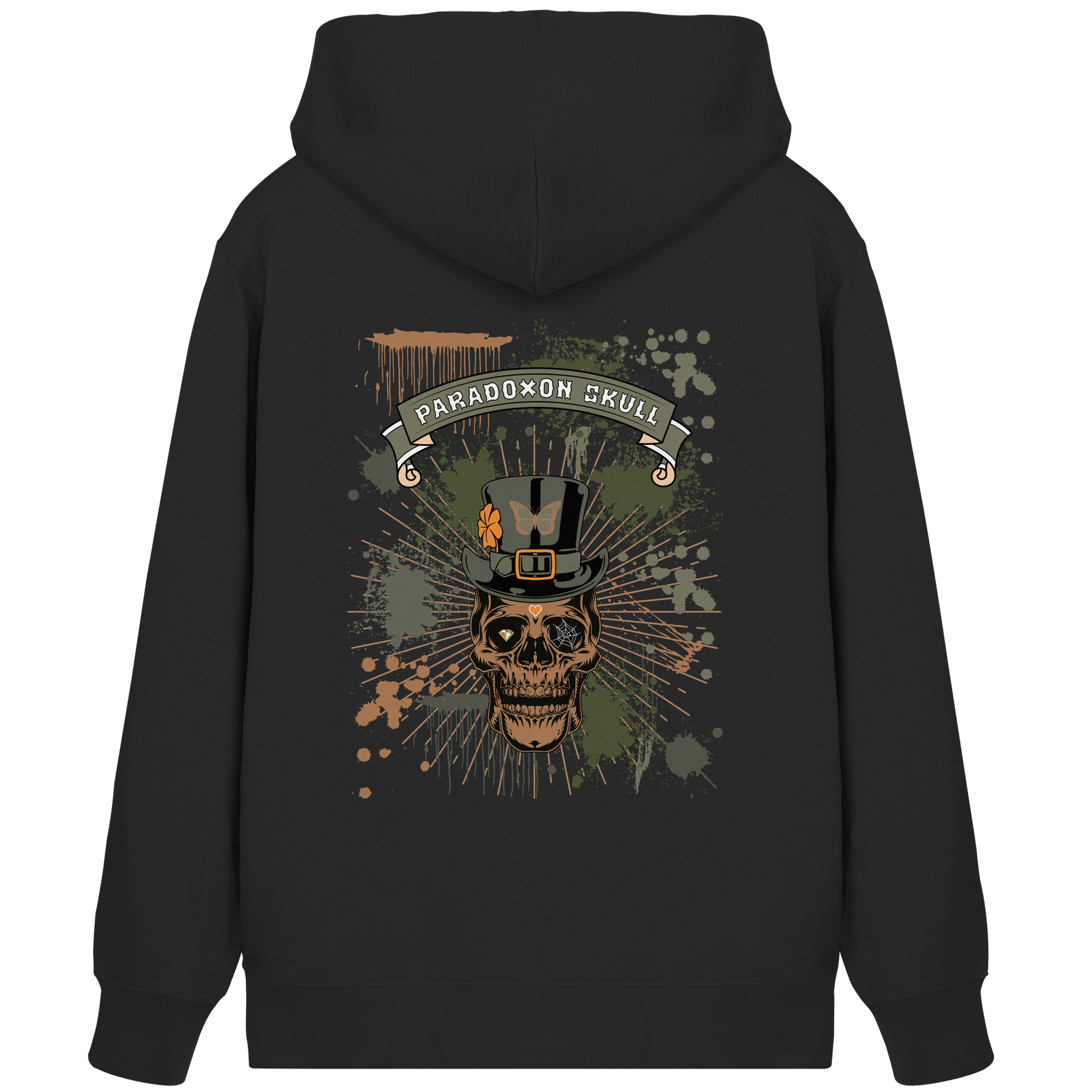 Das Leben zeigt sich als ein widersprüchliches Zusammenspiel von Vergänglichkeit und Schönheit, dargestellt durch den Totenkopf mit Zylinderhut und Schmetterling. Das Kleeblatt symbolisiert Hoffnung, der Diamant im rechten Auge steht für Reinheit, und das Spinnennetz im linken Auge verkörpert Komplexität. Das Herz auf der Stirn erinnert an die Liebe und Leidenschaft, die das Leben ausmachen.