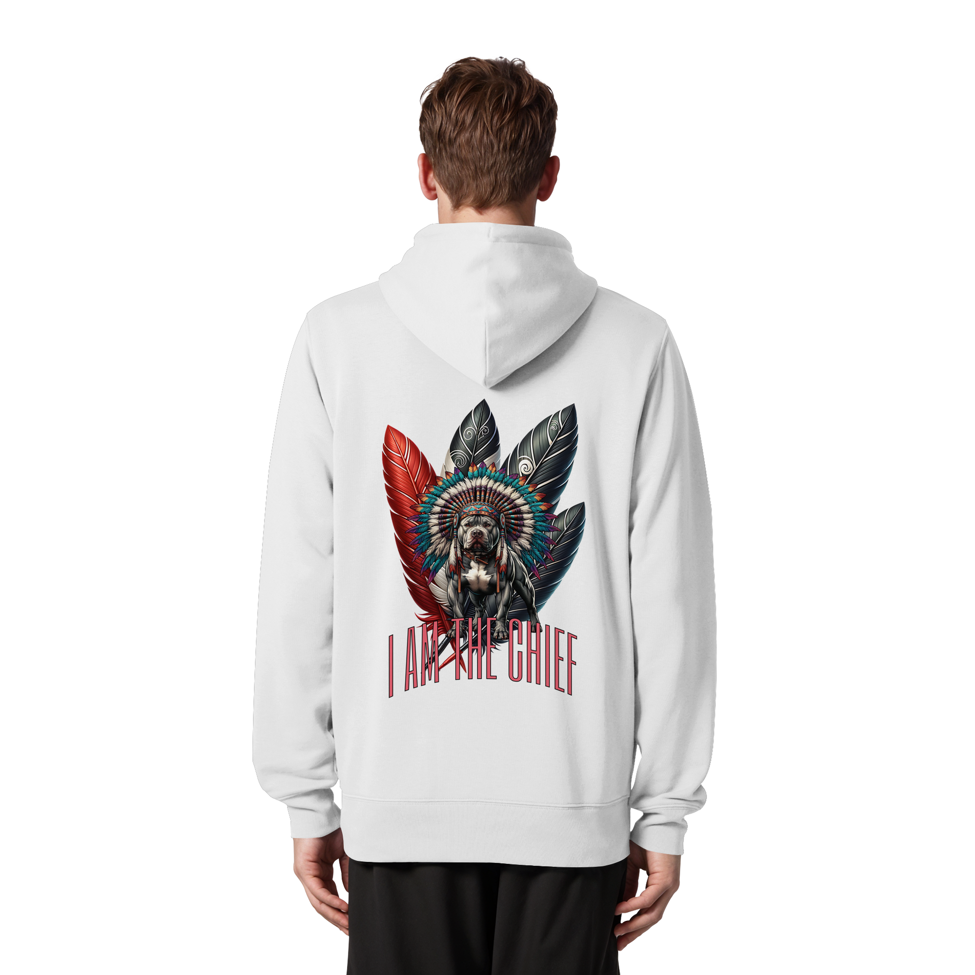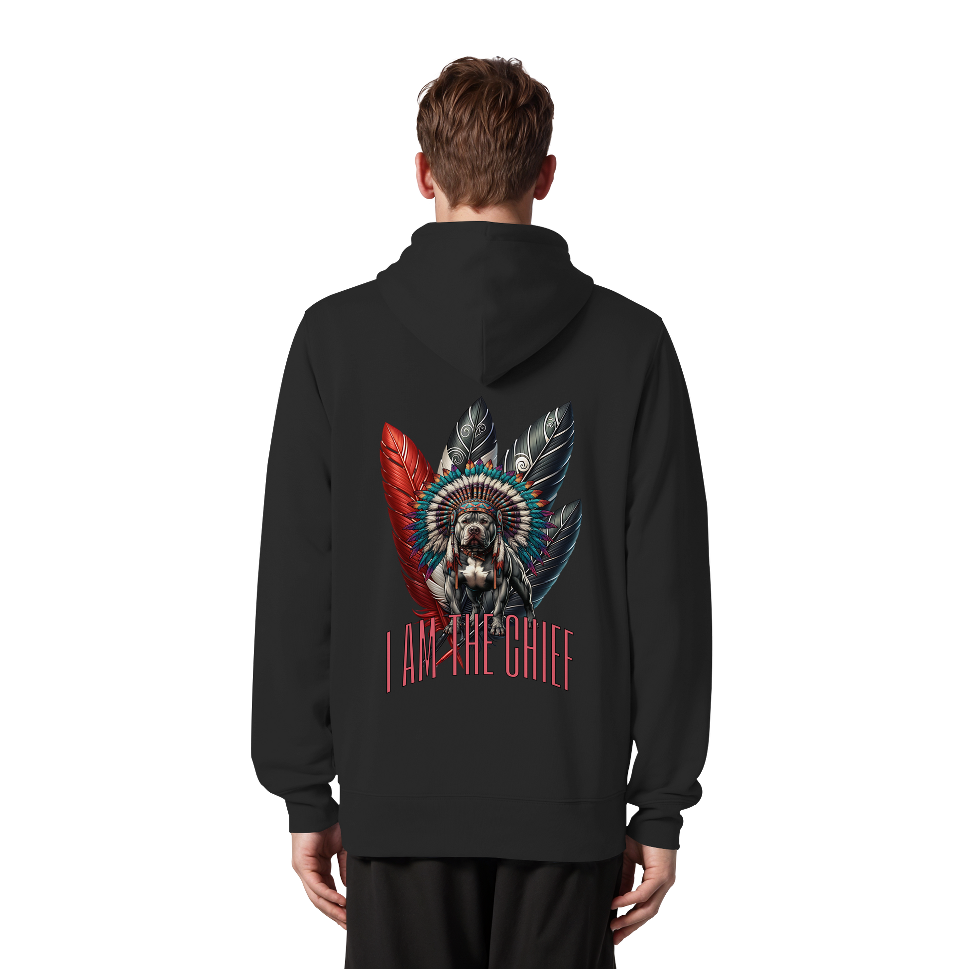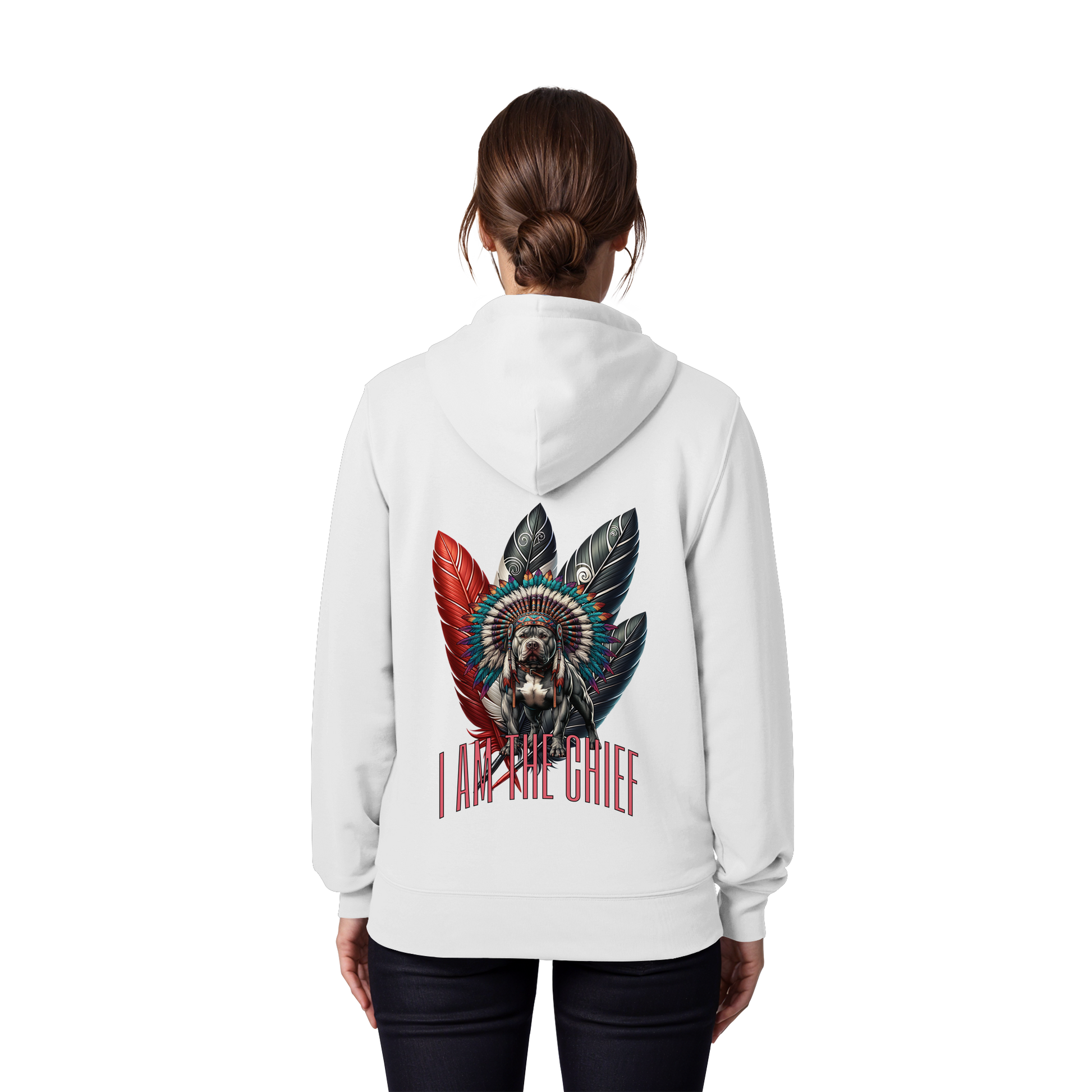 Erwecken Sie Ihren inneren Anführer mit dem "I am the Chief - Organic Zipper" Sweatshirt von Three5inity. Dieses einzigartige Design verbindet Loyalität und Weisheit, perfekt verkörpert durch den Amstaff mit Federnhaube. Tragen Sie es mit Stolz und zeigen Sie Ihre Persönlichkeit.