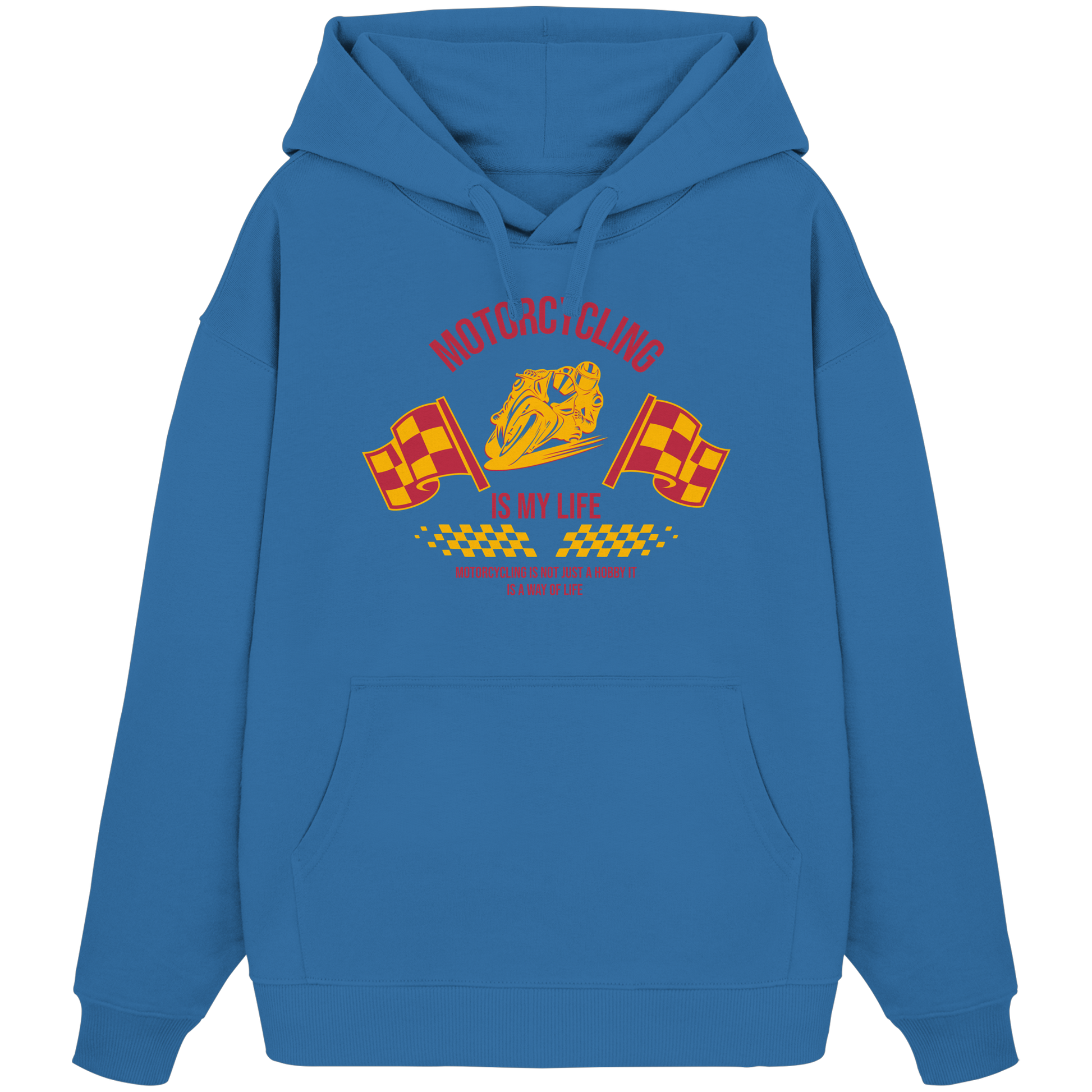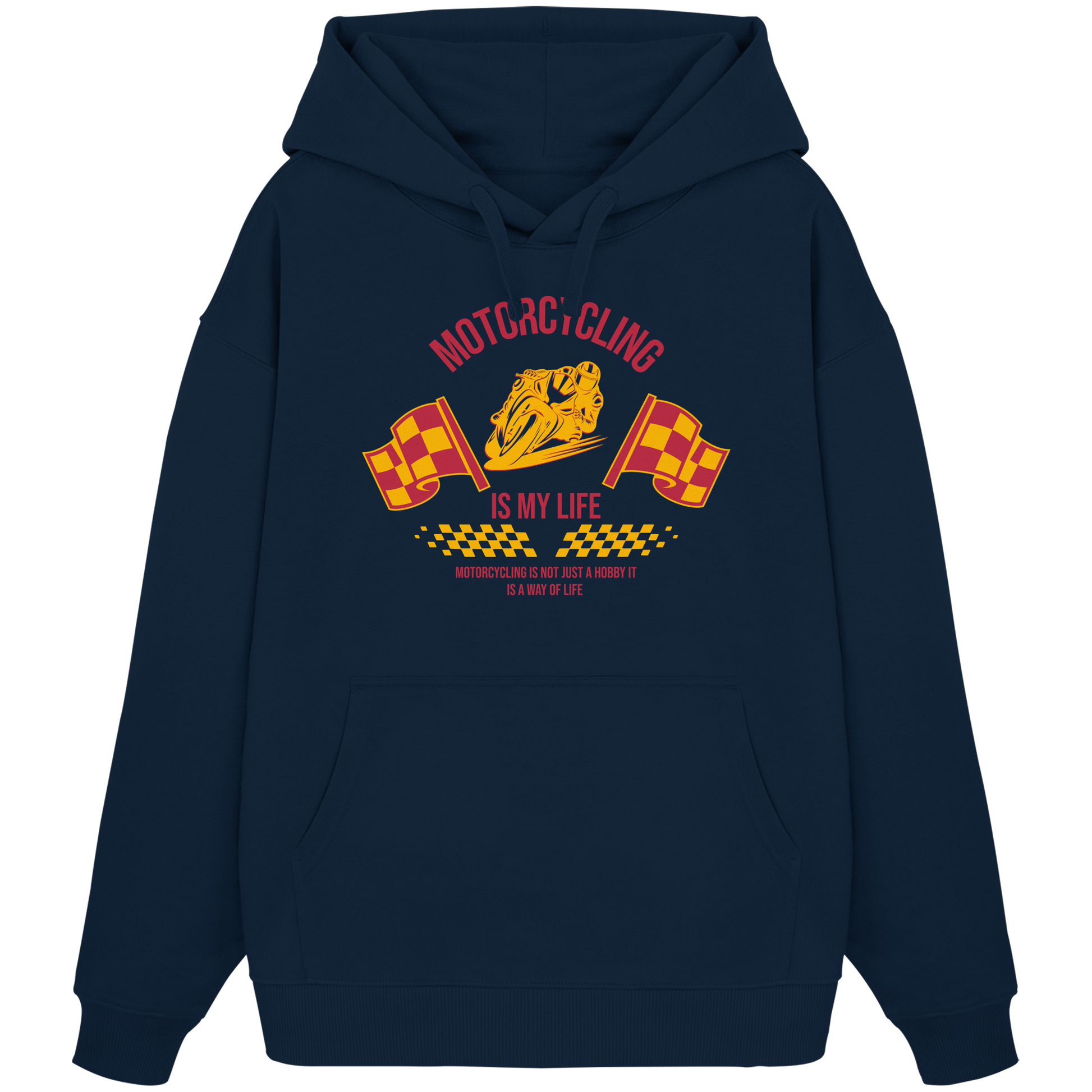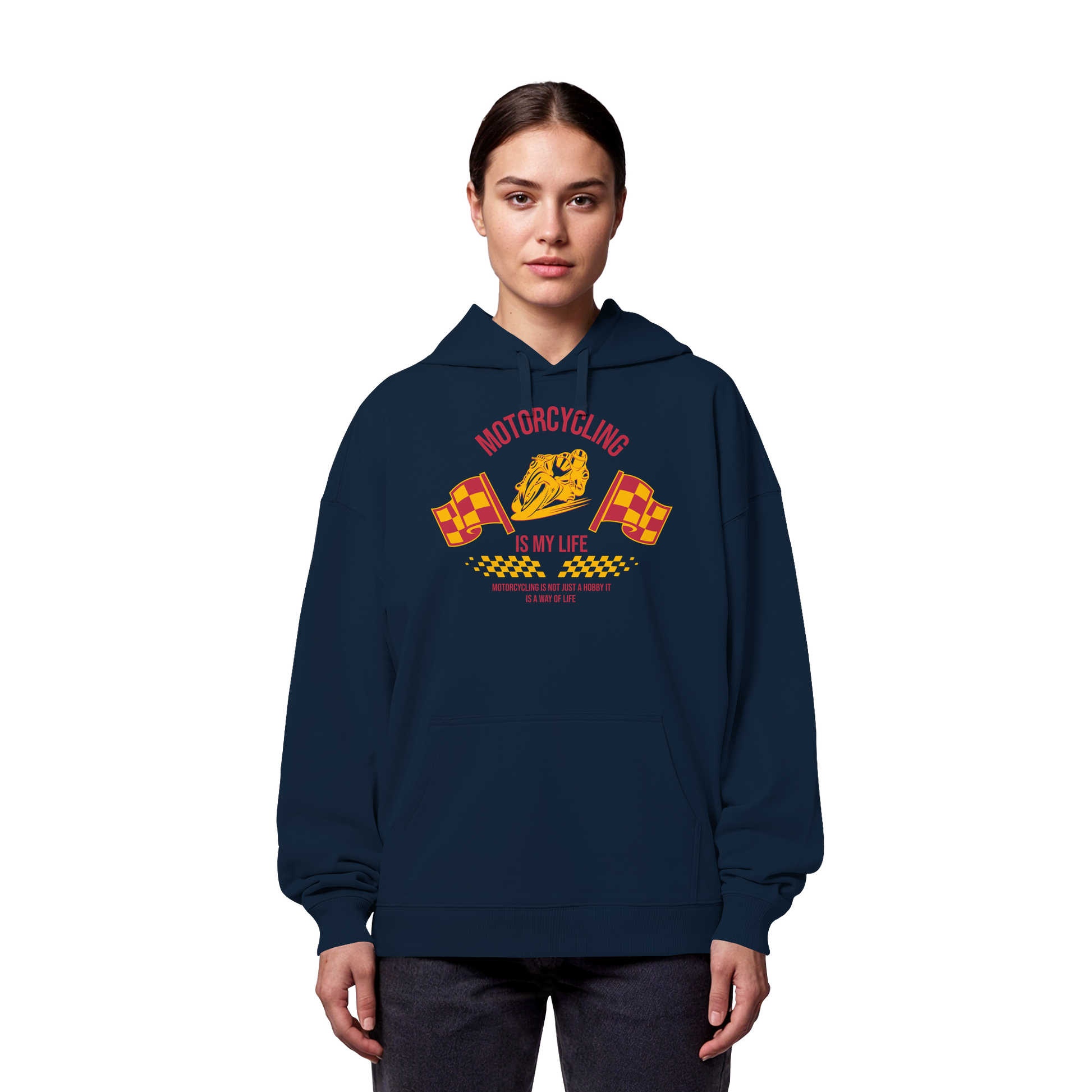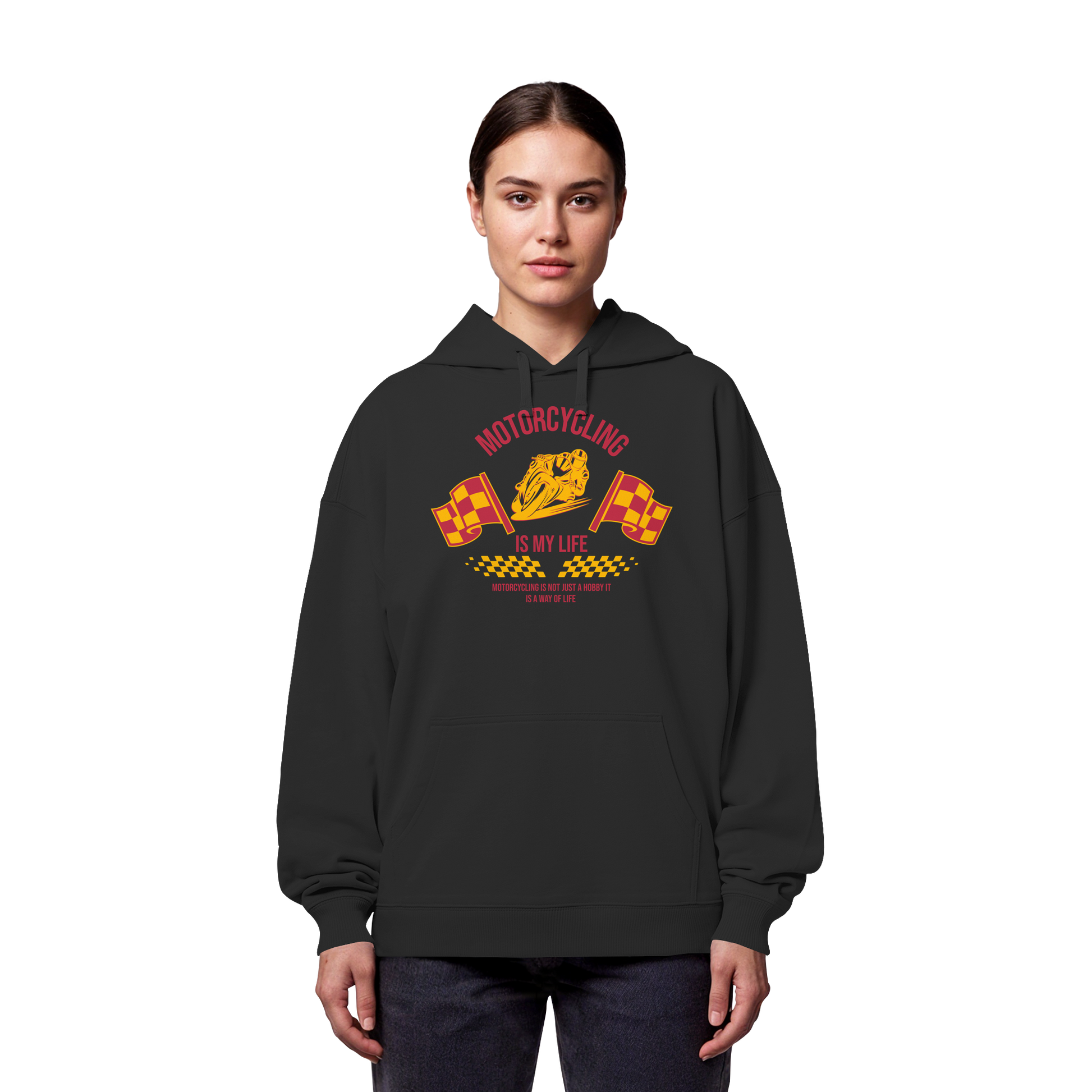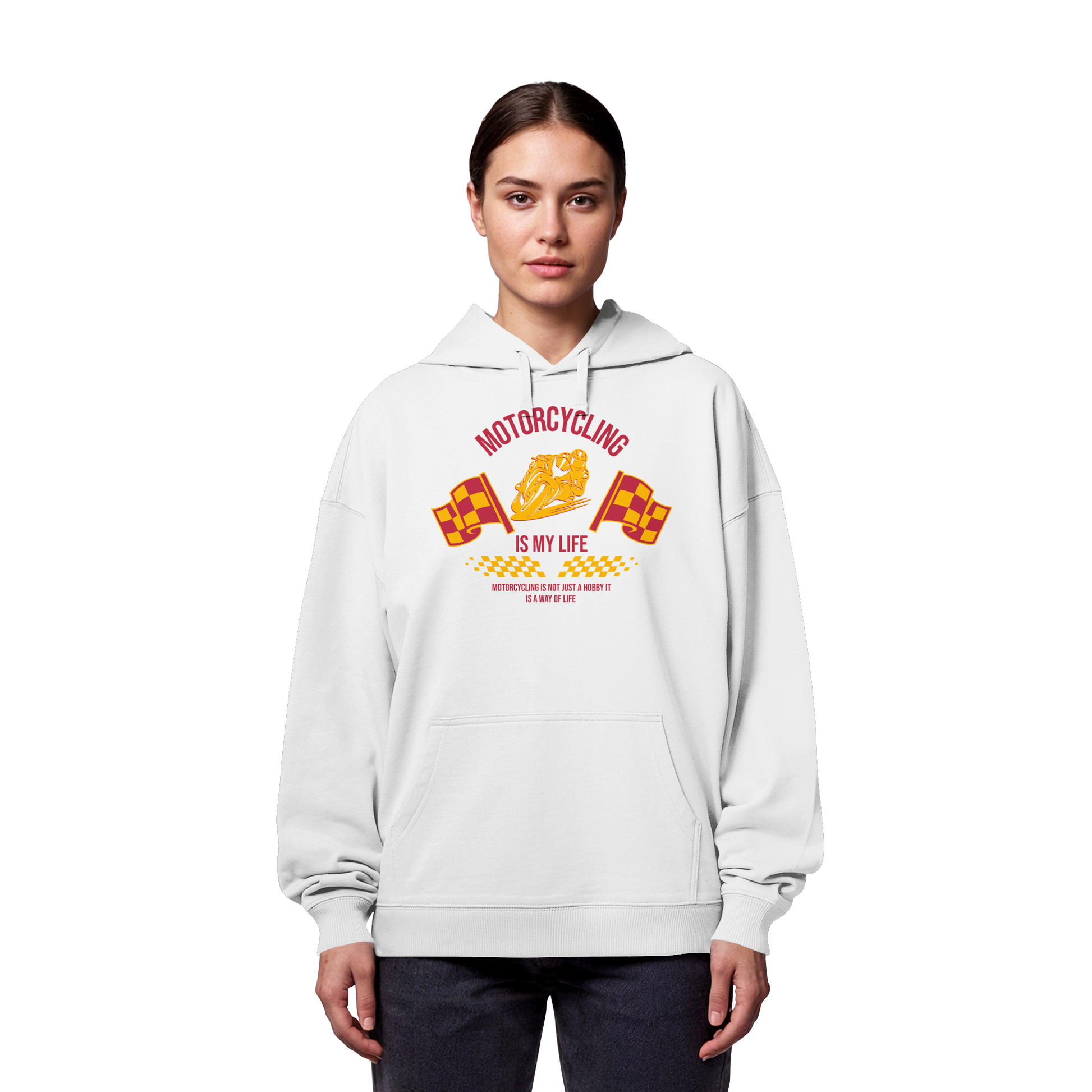Erleben Sie das Gefühl von Freiheit und Abenteuer mit unserem "Motorcycling is my Life - Organic Oversize Hoodie". Dieses einzigartige Design zeigt einen dynamischen Motorradrennfahrer, eingefasst von zwei Zielfahnen, und vermittelt pure Leidenschaft für das Motorradfahren. Der Slogan "Motorcycling is not just a hobby it is a way of life" spricht direkt zu Ihrem Herzen und unterstreicht die Verbindung zwischen Fahrer und Maschine.