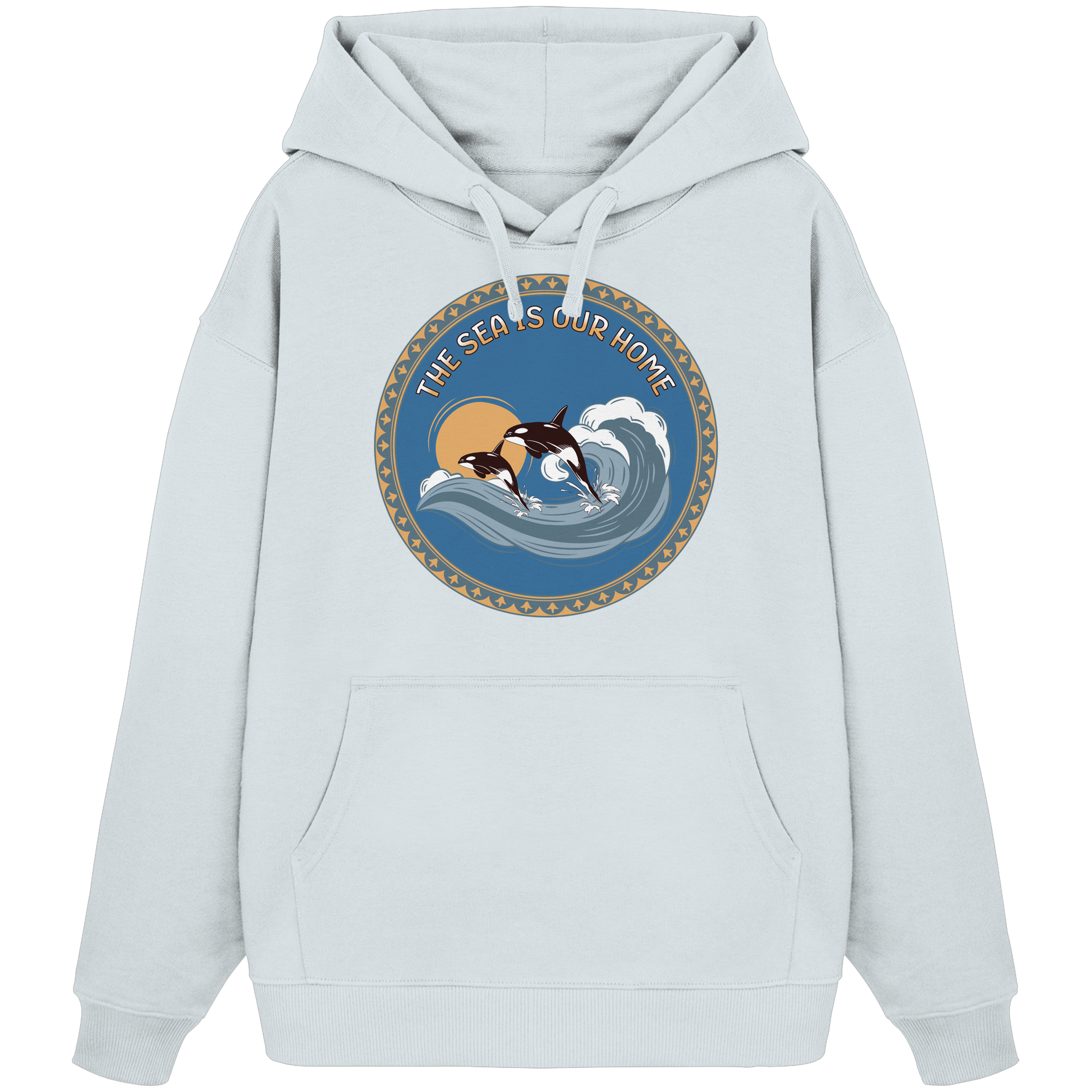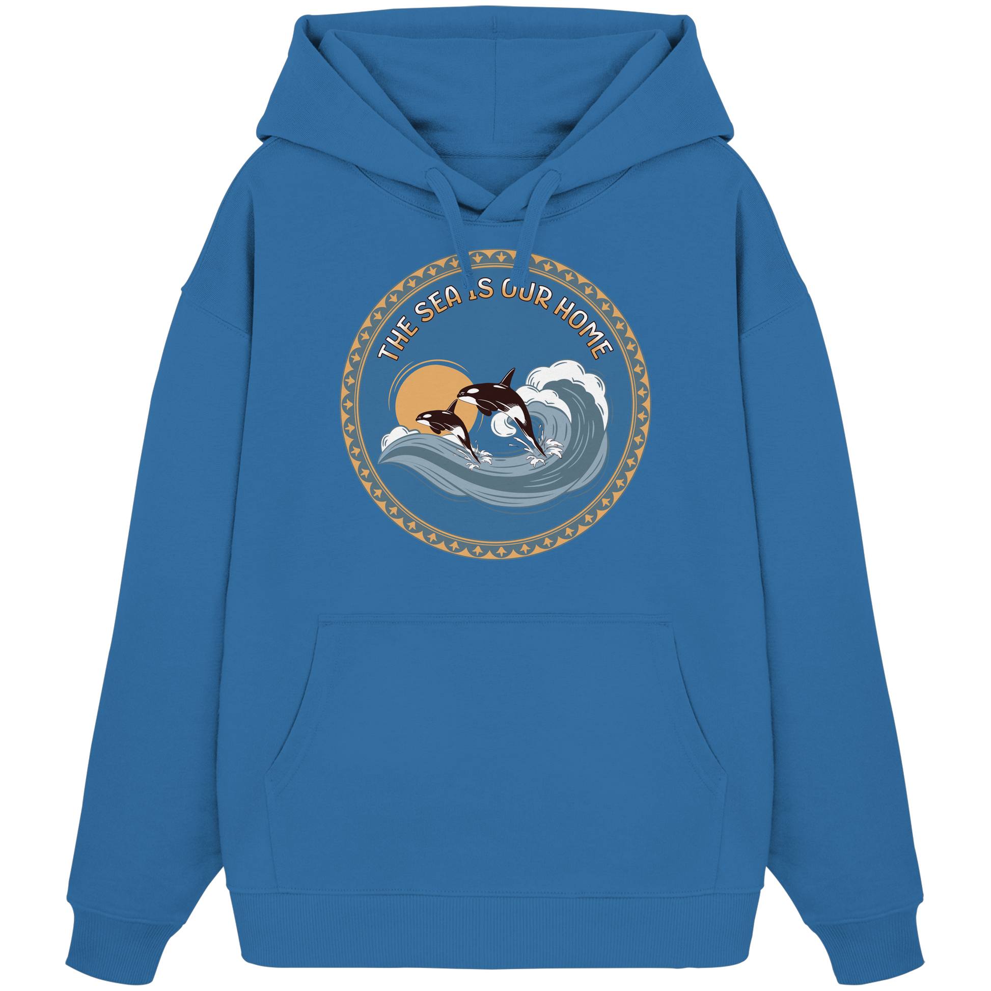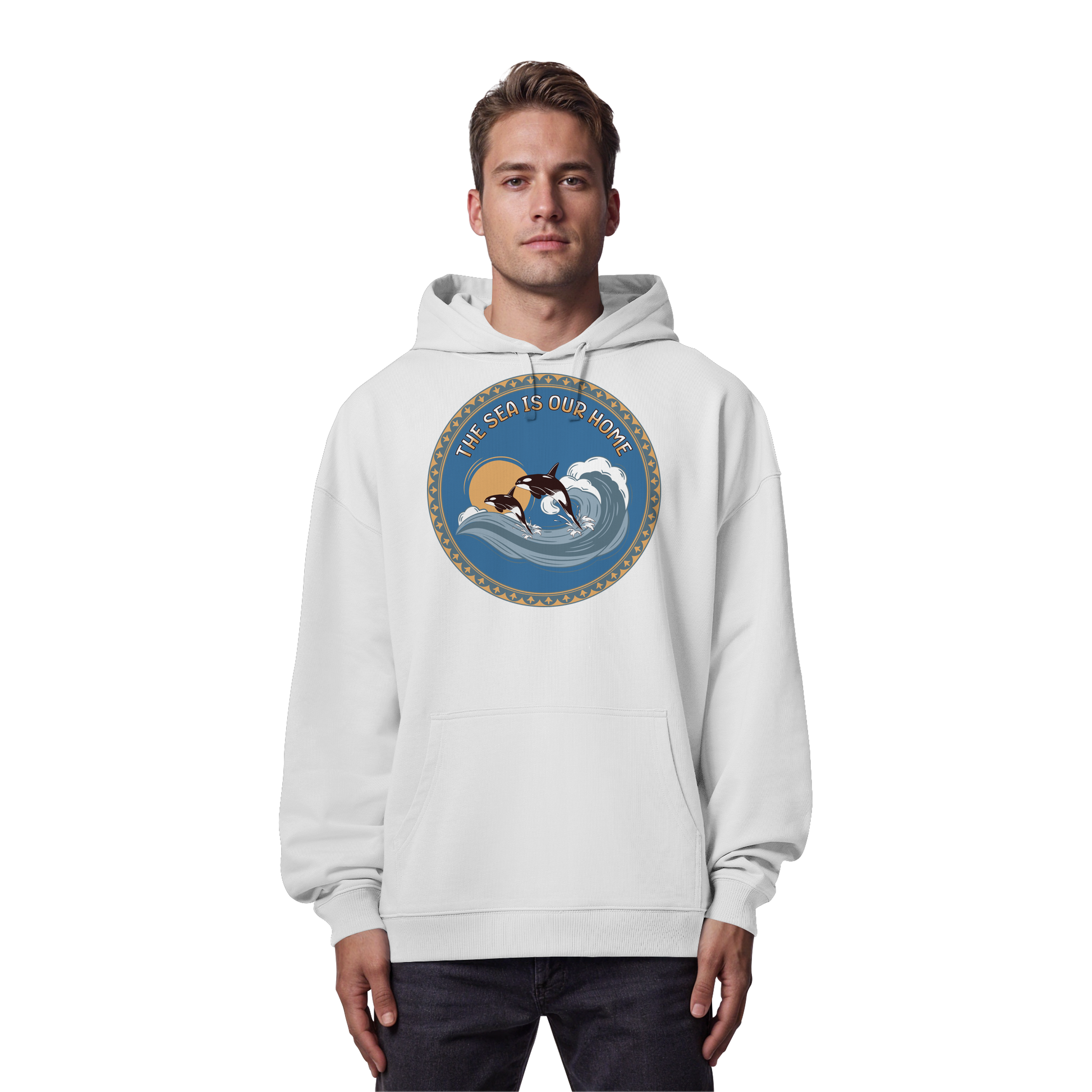 Erleben Sie das Gefühl von Freiheit mit dem Orca - Organic Oversize Hoodie von Three5inity. Dieses einzigartige Kleidungsstück verbindet stilvolles Design mit emotionaler Bedeutung. Die beeindruckenden Orcas, die durch kraftvolle Wellen brechen, symbolisieren Freiheit und die Verbundenheit mit der Natur. Der inspirierende Slogan "The Sea Is Our Home" erinnert uns daran, unsere Umwelt zu schätzen und zu schützen.