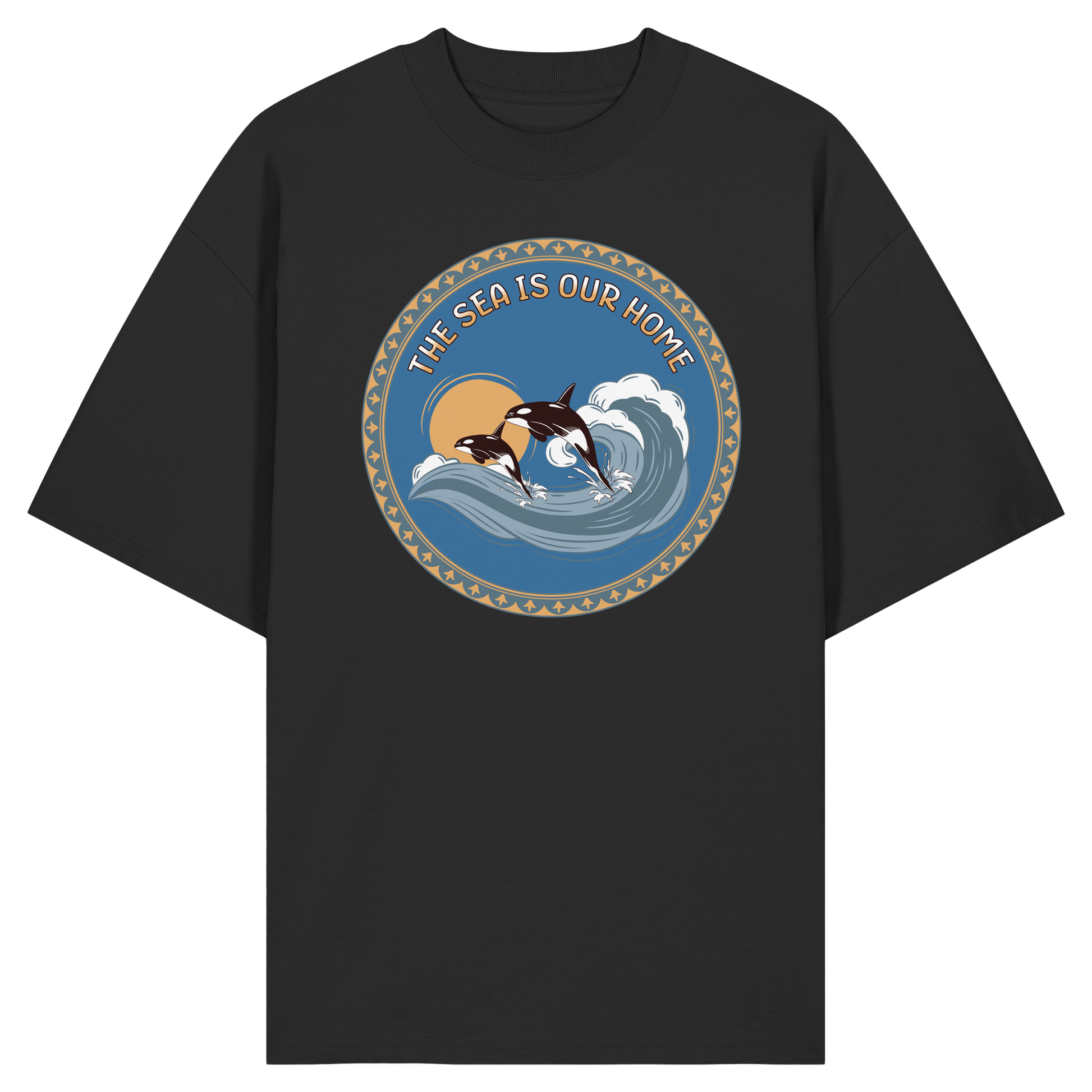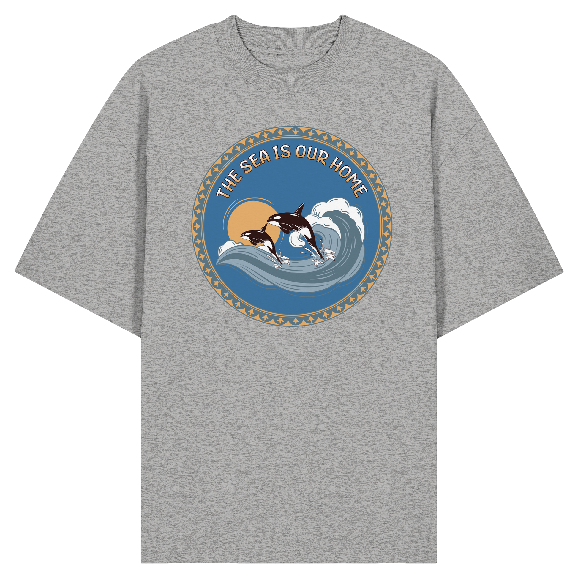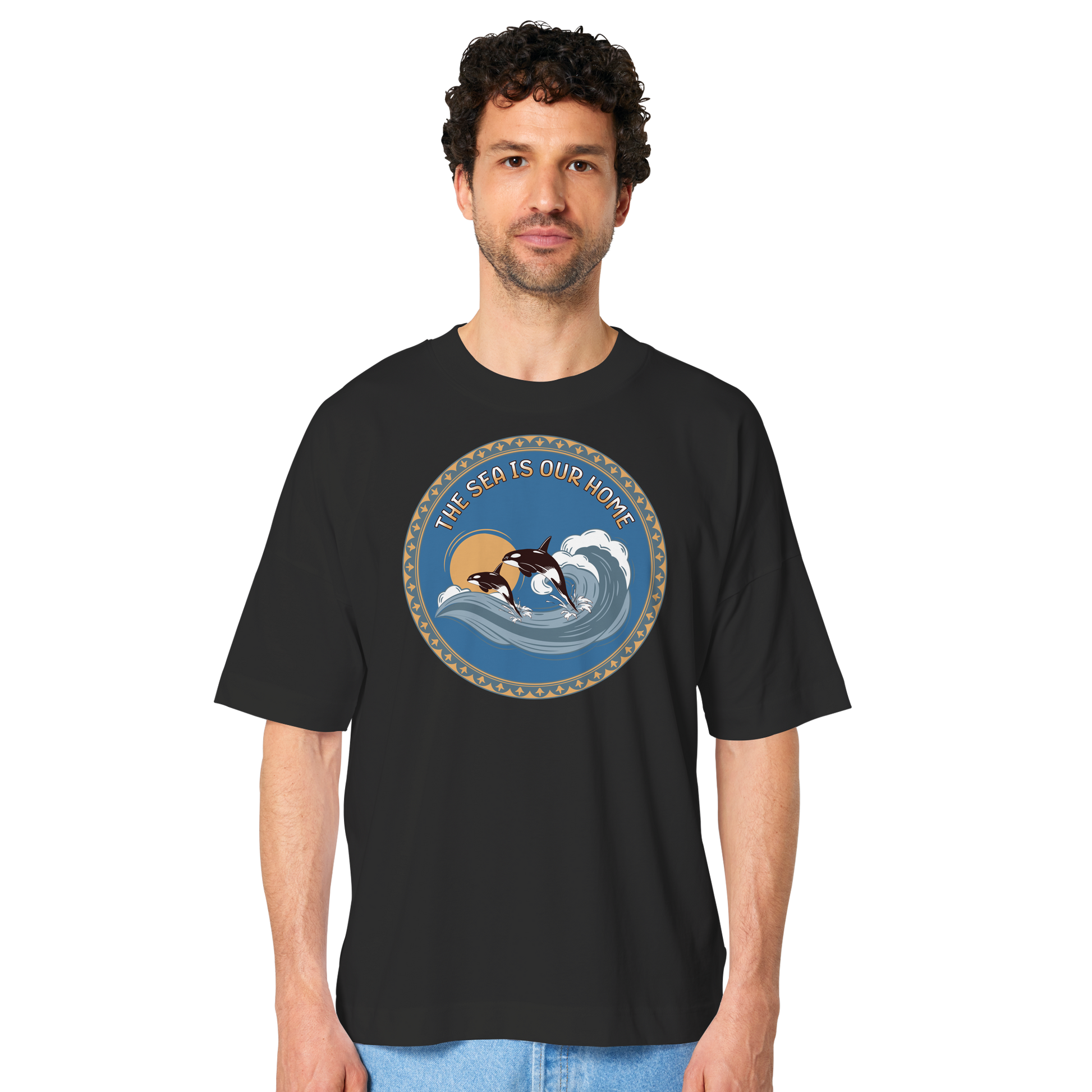Fühle die Freiheit und Verbundenheit mit der Natur mit unserem Orca - Organic Oversize Shirt. Die majestätischen Orcas, die durch kraftvolle Wellen brechen, erinnern uns daran, dass „The Sea Is Our Home“. Diese harmonischen Blautöne und warmen Akzente symbolisieren Freiheit und Naturverbundenheit.