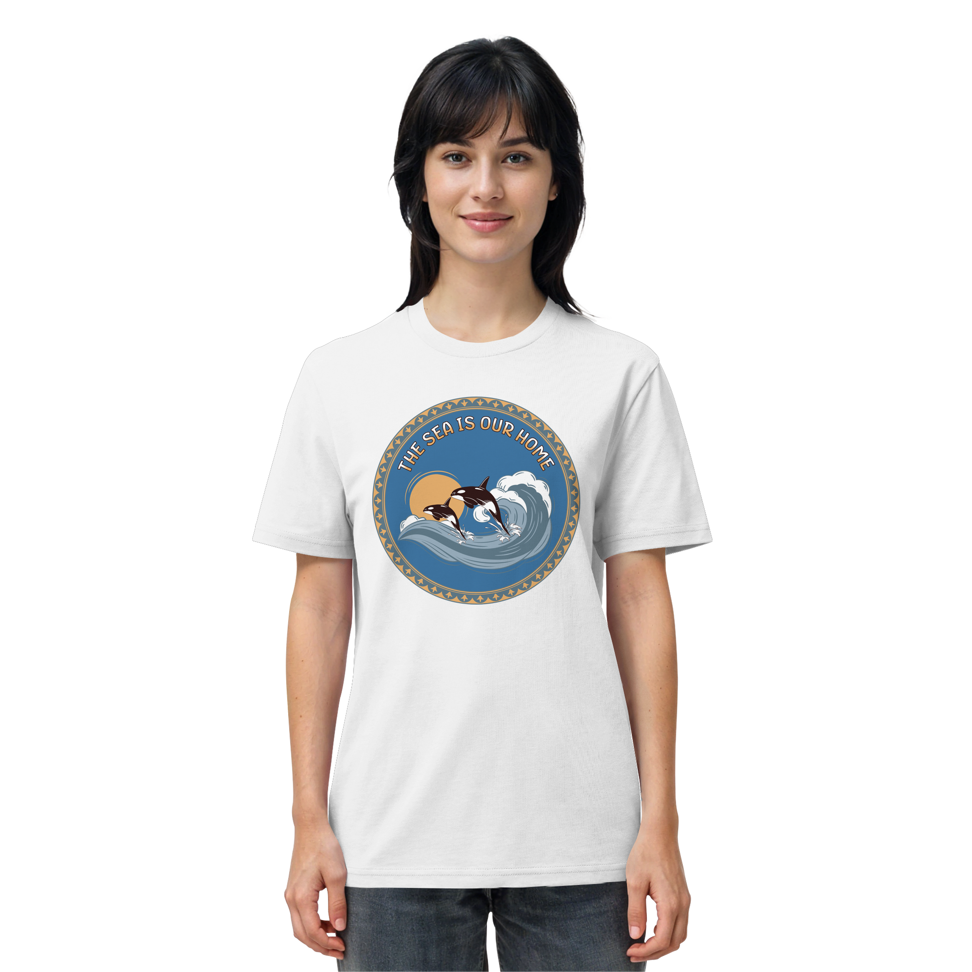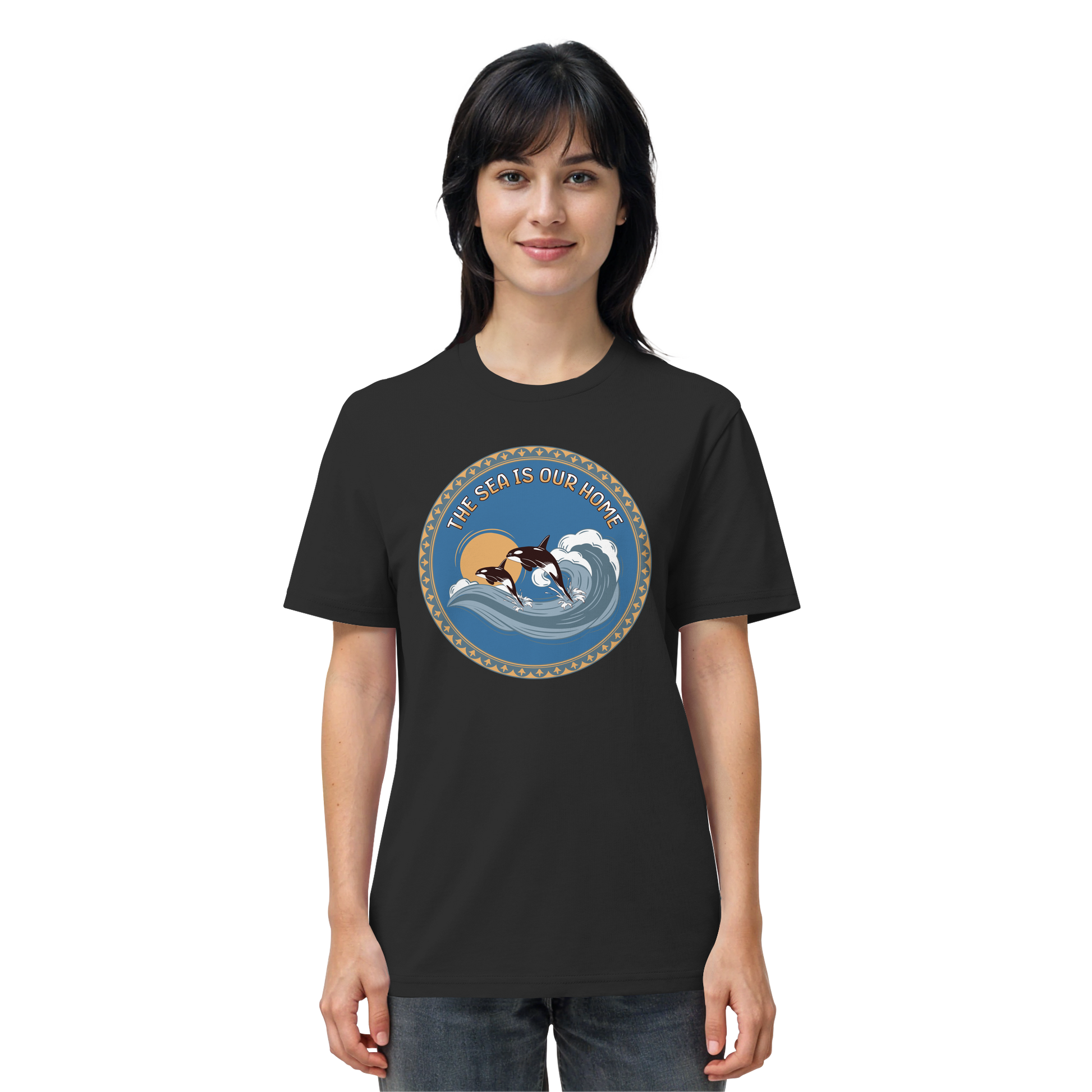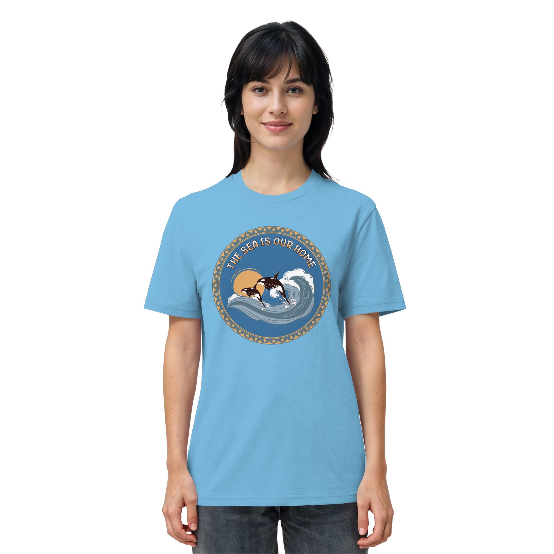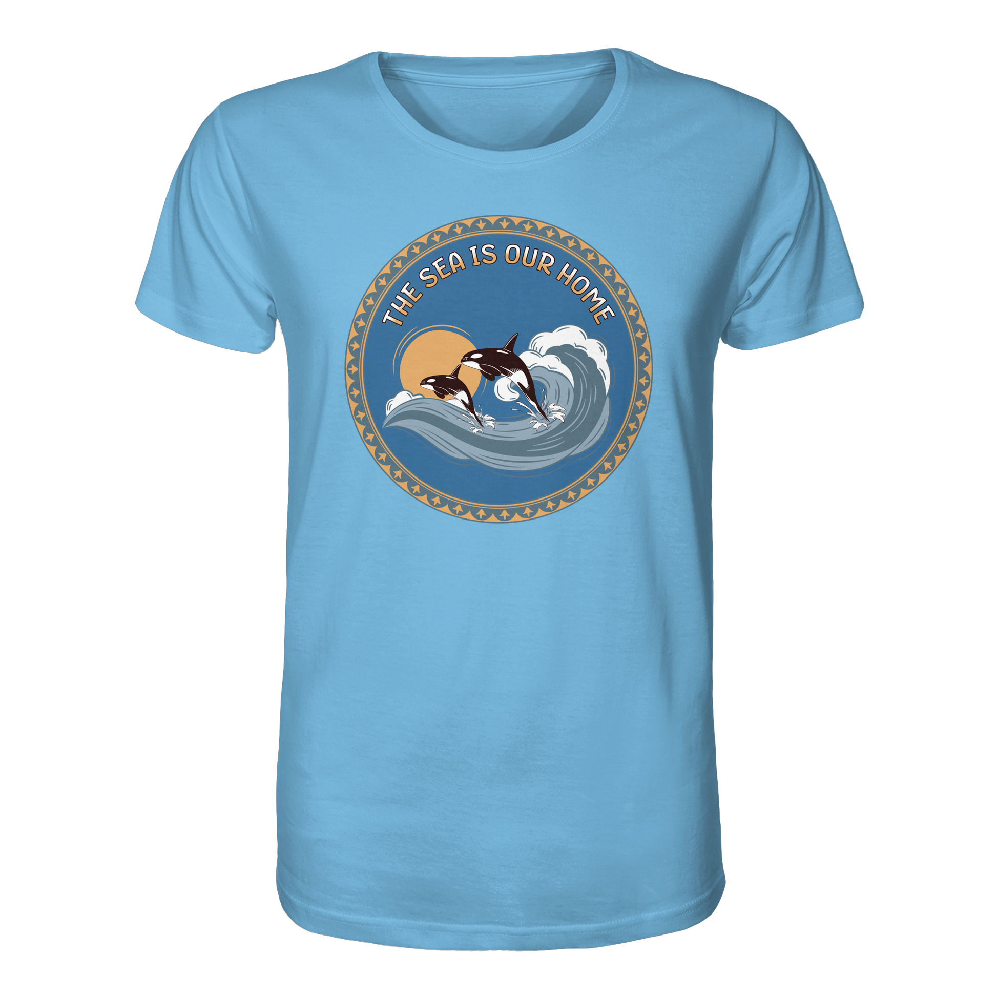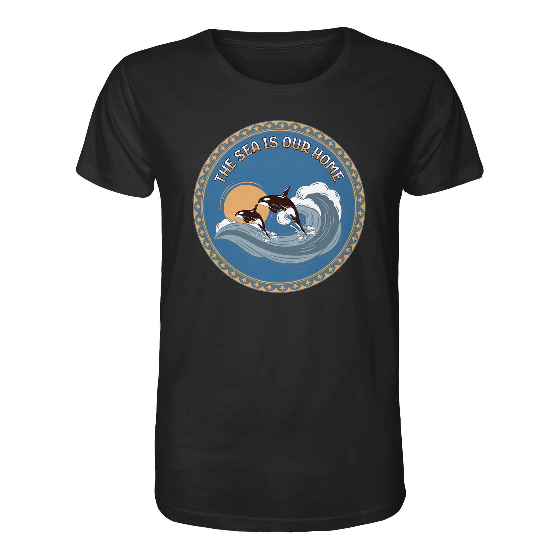 Erleben Sie die Freiheit des Ozeans mit dem "Orca - Organic Shirt" von Three5inity. Dieses einzigartige Design zeigt majestätische Orcas, die durch kraftvolle Wellen gleiten, begleitet von dem inspirierenden Slogan "The Sea Is Our Home". Die harmonischen Blautöne und warmen Akzente symbolisieren eine tiefe Verbundenheit mit der Natur.