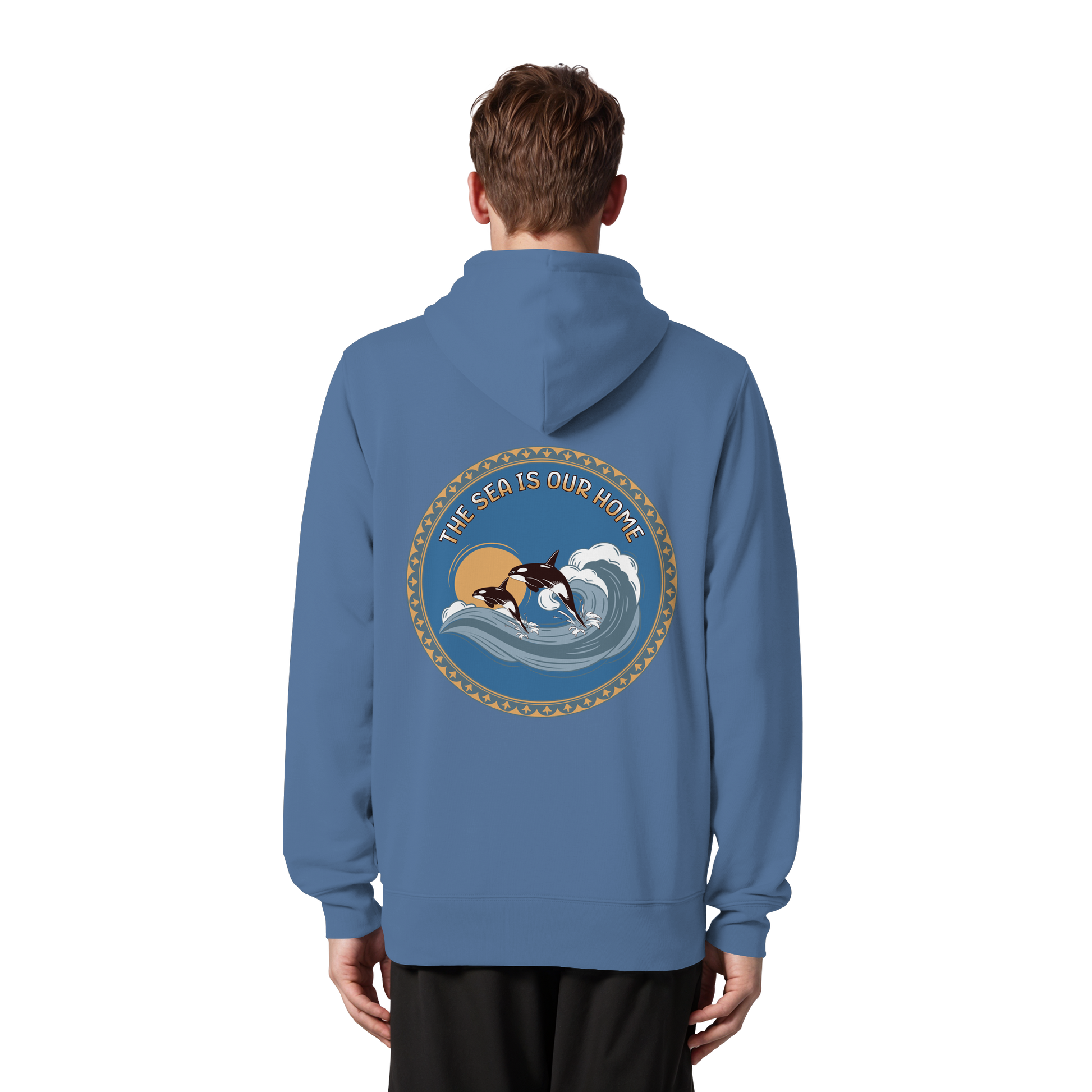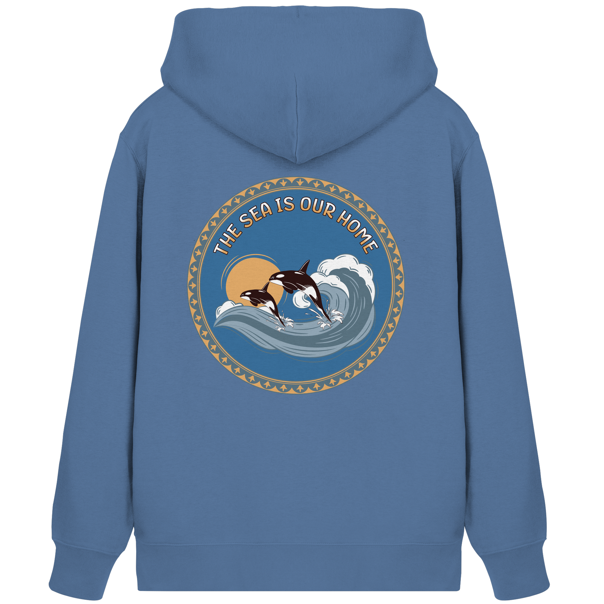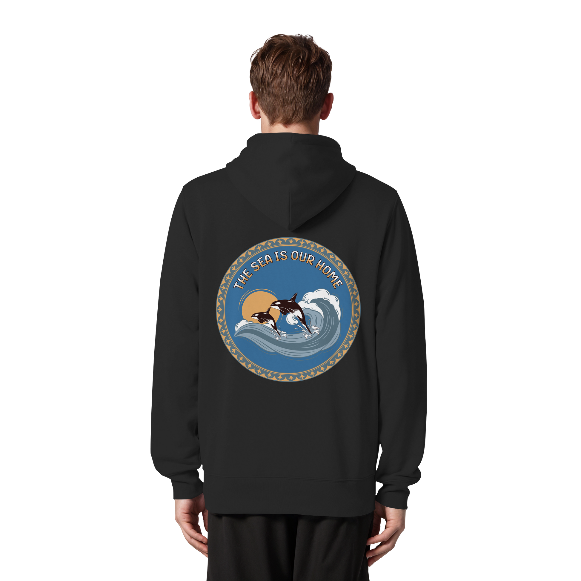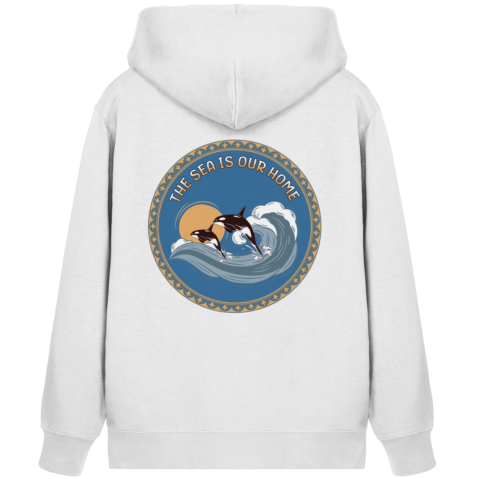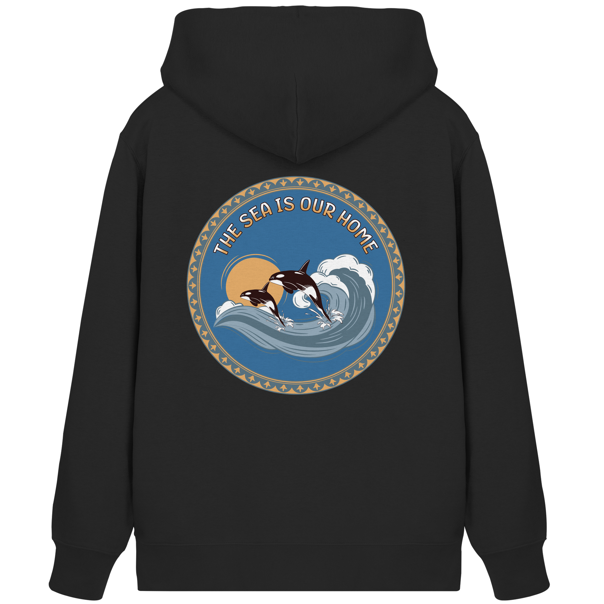 Dieses einzigartige Design zeigt Orcas in harmonischen Blautönen und warmen Akzenten. Der Slogan "The Sea Is Our Home" erinnert uns an die Bedeutung der Ozeane.