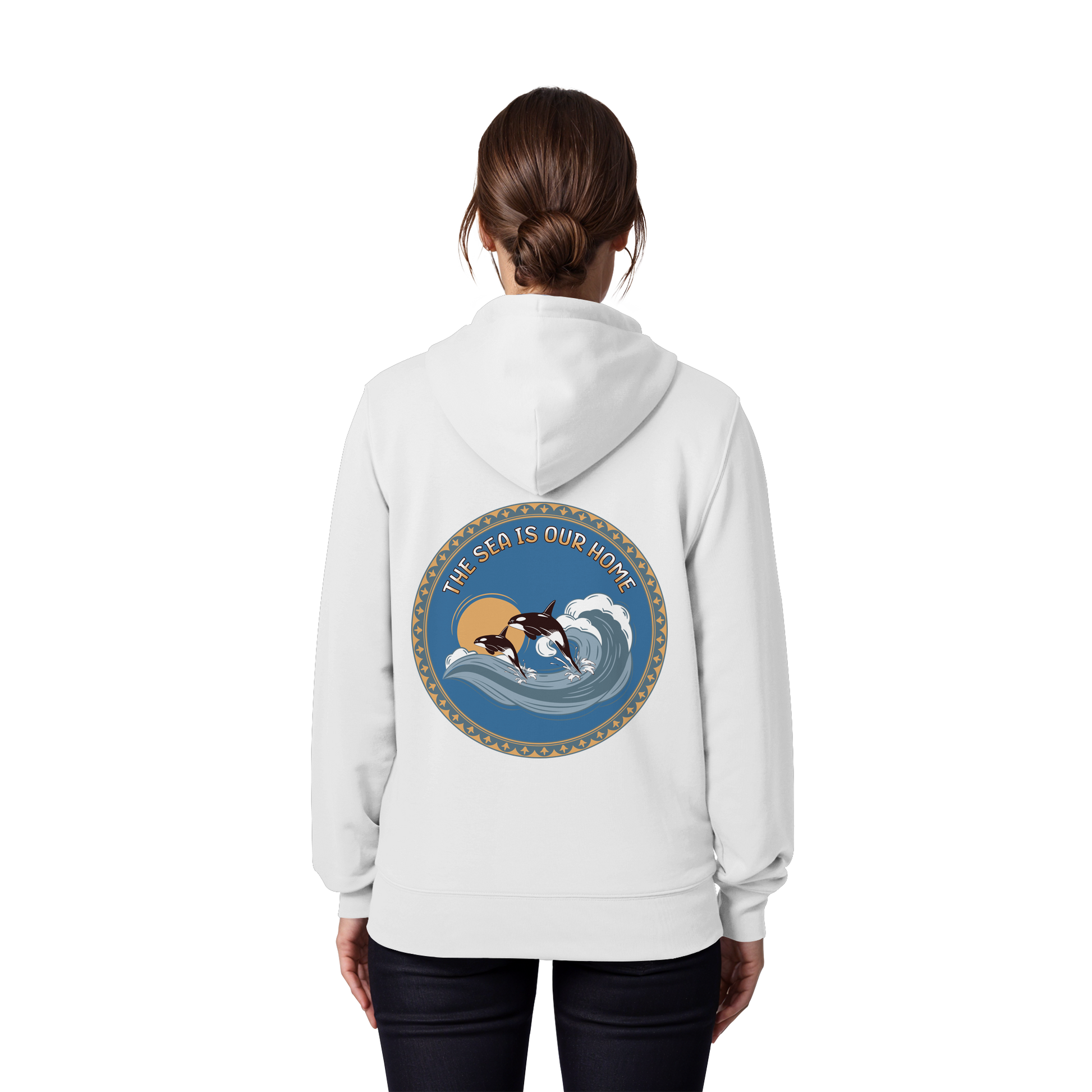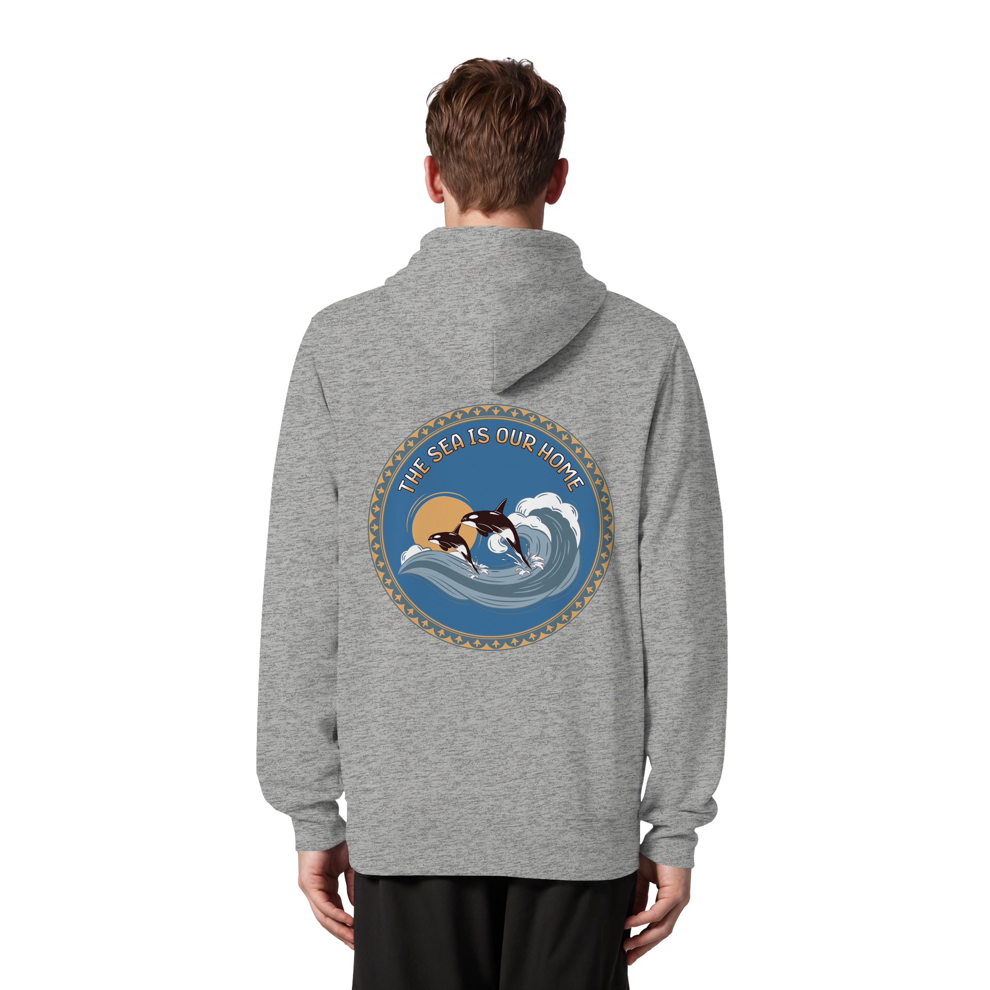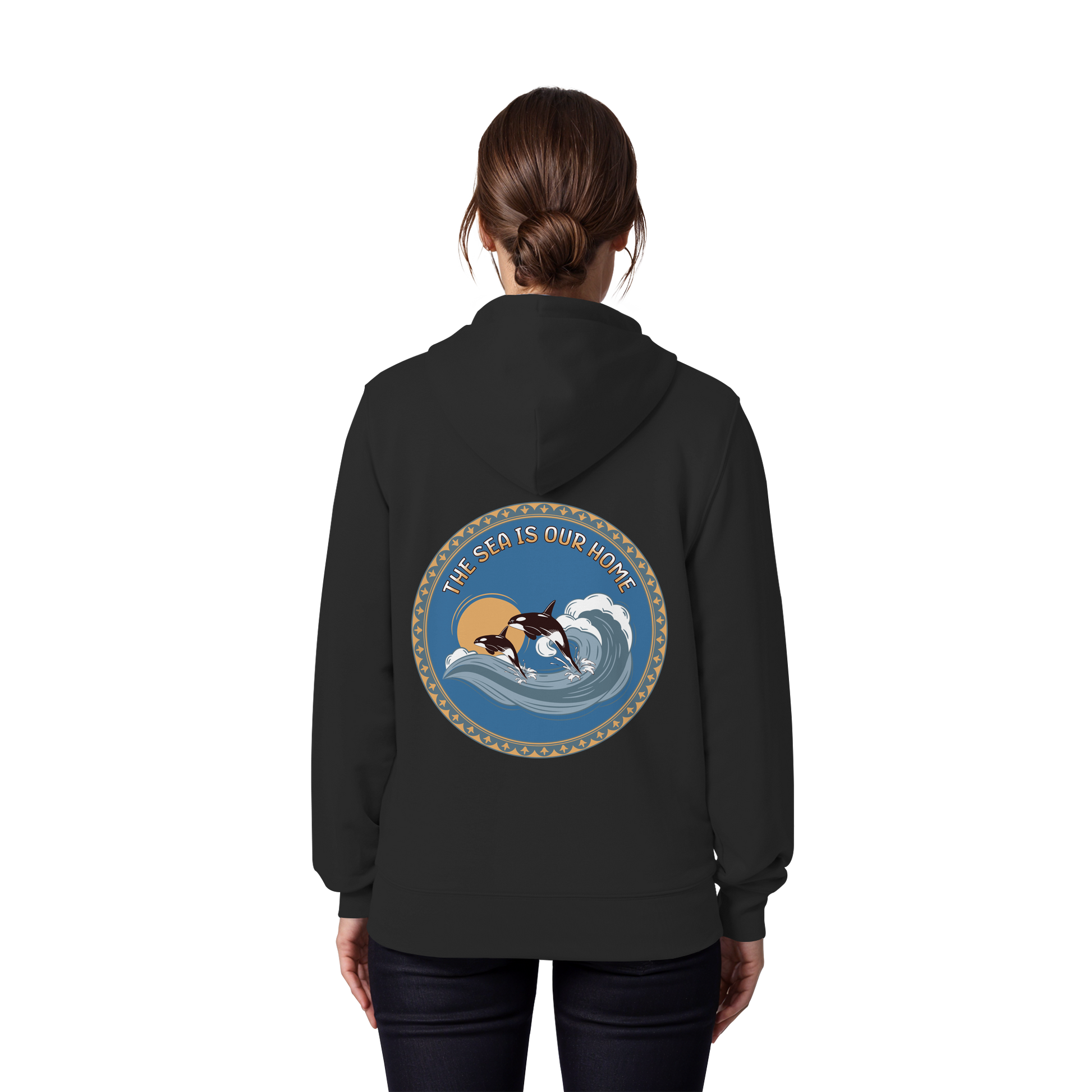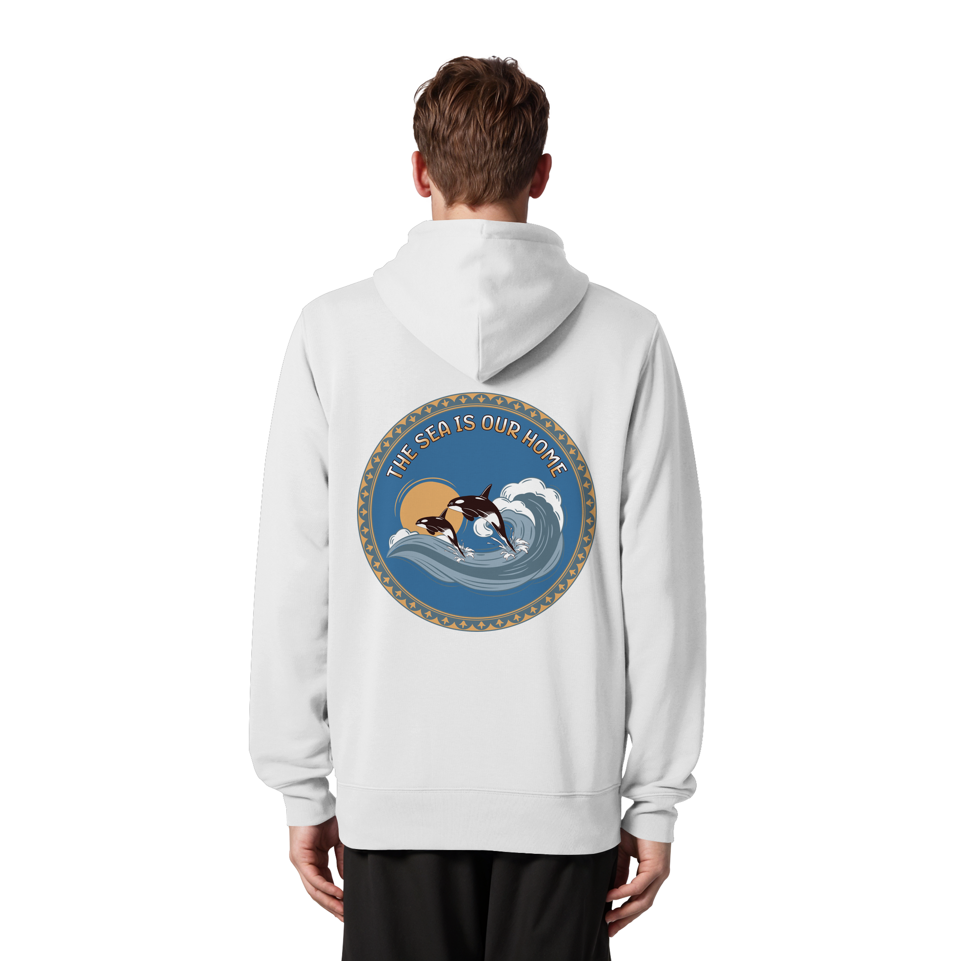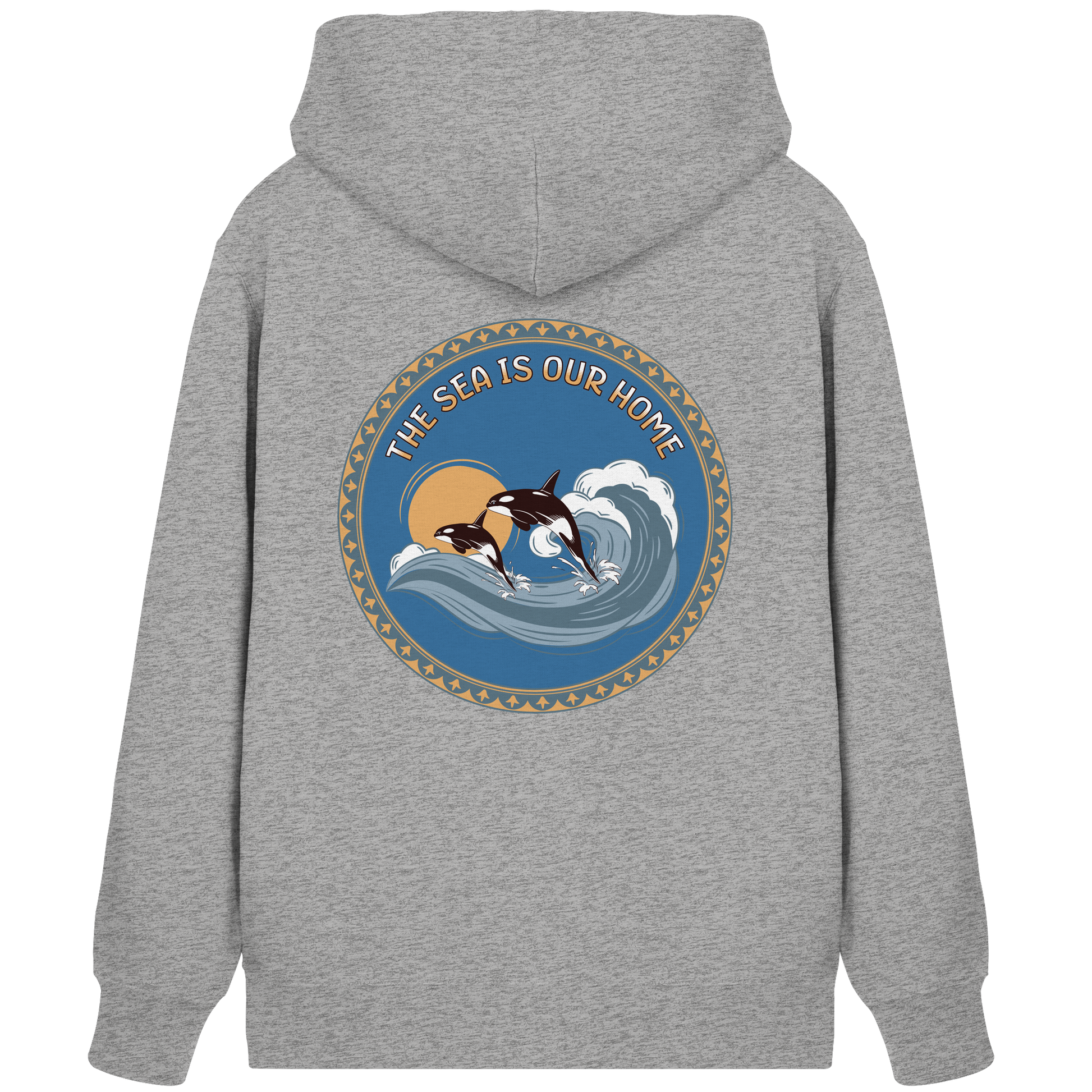Dieses einzigartige Design zeigt Orcas in harmonischen Blautönen und warmen Akzenten. Der Slogan "The Sea Is Our Home" erinnert uns an die Bedeutung der Ozeane.