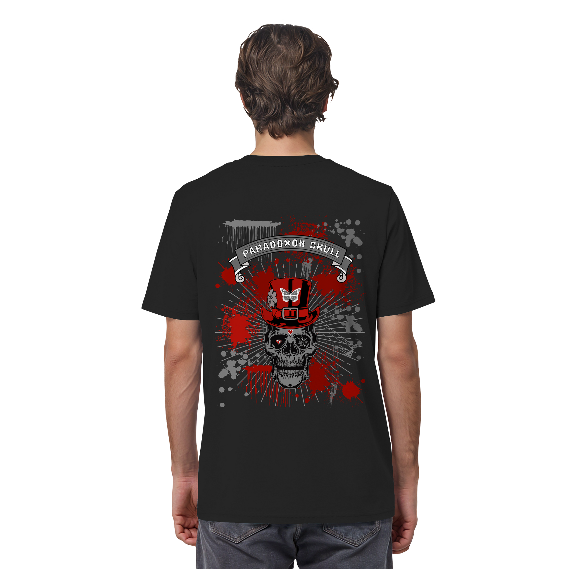 Das Leben zeigt sich als ein widersprüchliches Zusammenspiel von Vergänglichkeit und Schönheit, dargestellt durch den Totenkopf mit Zylinderhut und Schmetterling. Das Kleeblatt symbolisiert Hoffnung, der Diamant im rechten Auge steht für Reinheit, und das Spinnennetz im linken Auge verkörpert Komplexität. Das Herz auf der Stirn erinnert an die Liebe und Leidenschaft, die das Leben ausmachen.