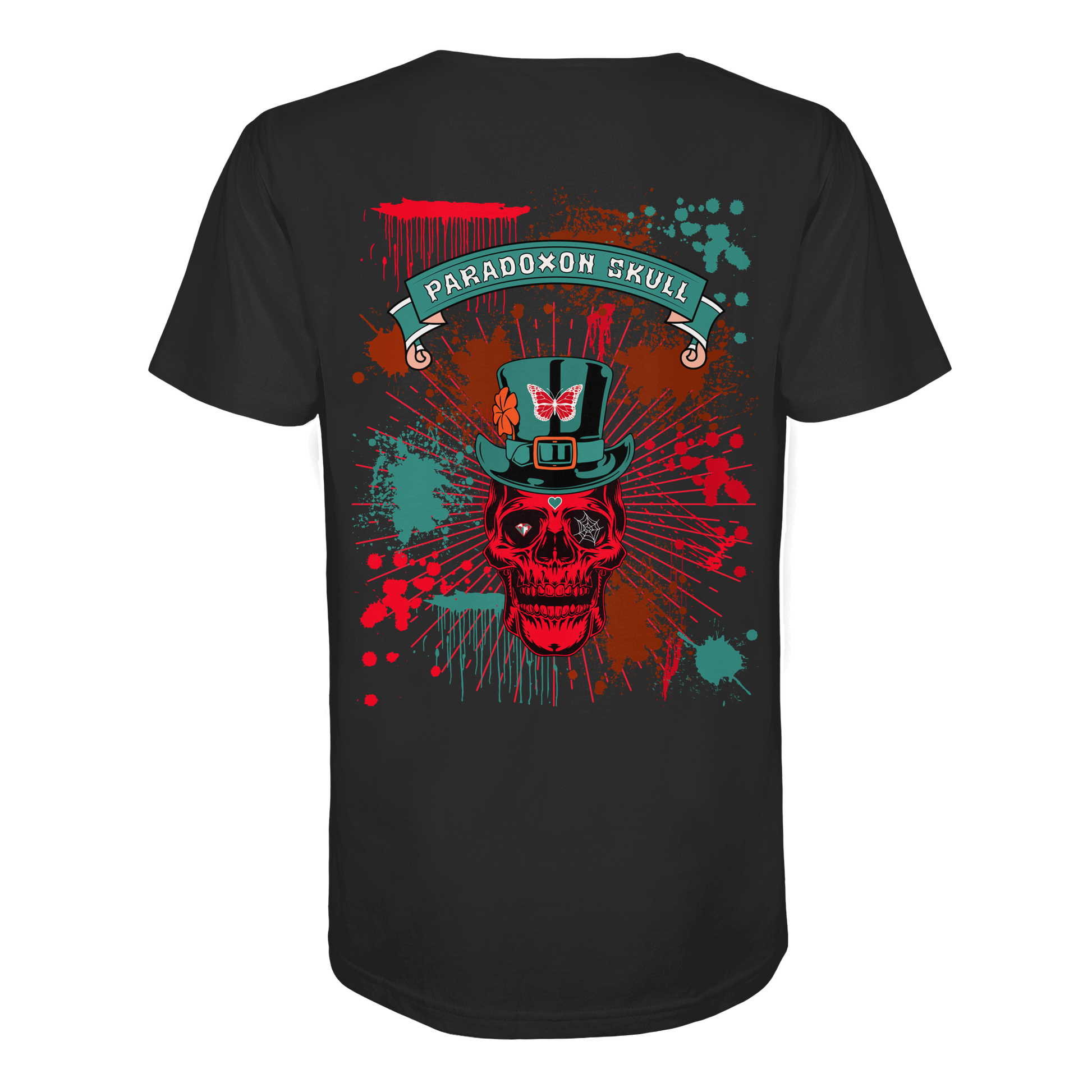 Das Leben zeigt sich als ein widersprüchliches Zusammenspiel von Vergänglichkeit und Schönheit, dargestellt durch den Totenkopf mit Zylinderhut und Schmetterling. Das Kleeblatt symbolisiert Hoffnung, der Diamant im rechten Auge steht für Reinheit, und das Spinnennetz im linken Auge verkörpert Komplexität. Das Herz auf der Stirn erinnert an die Liebe und Leidenschaft, die das Leben ausmachen.
