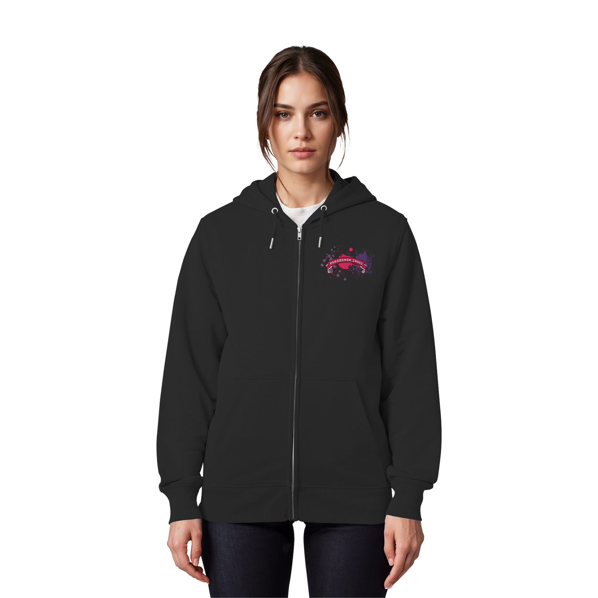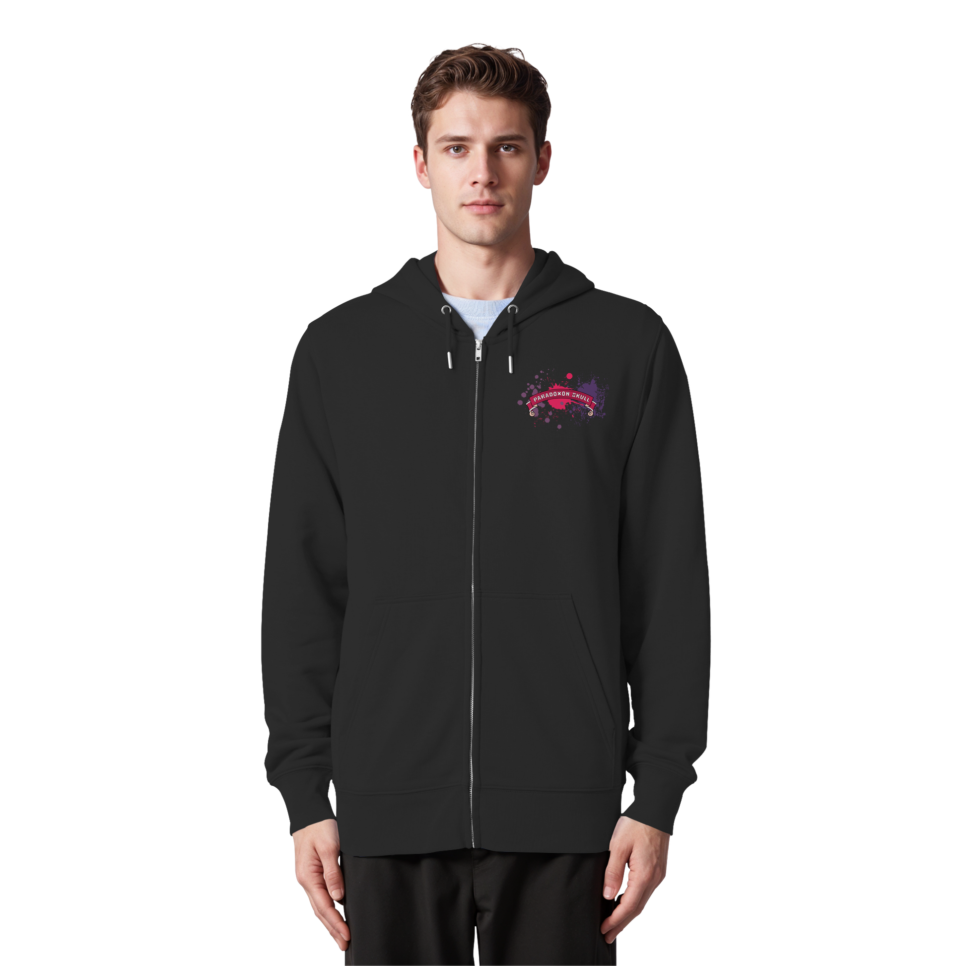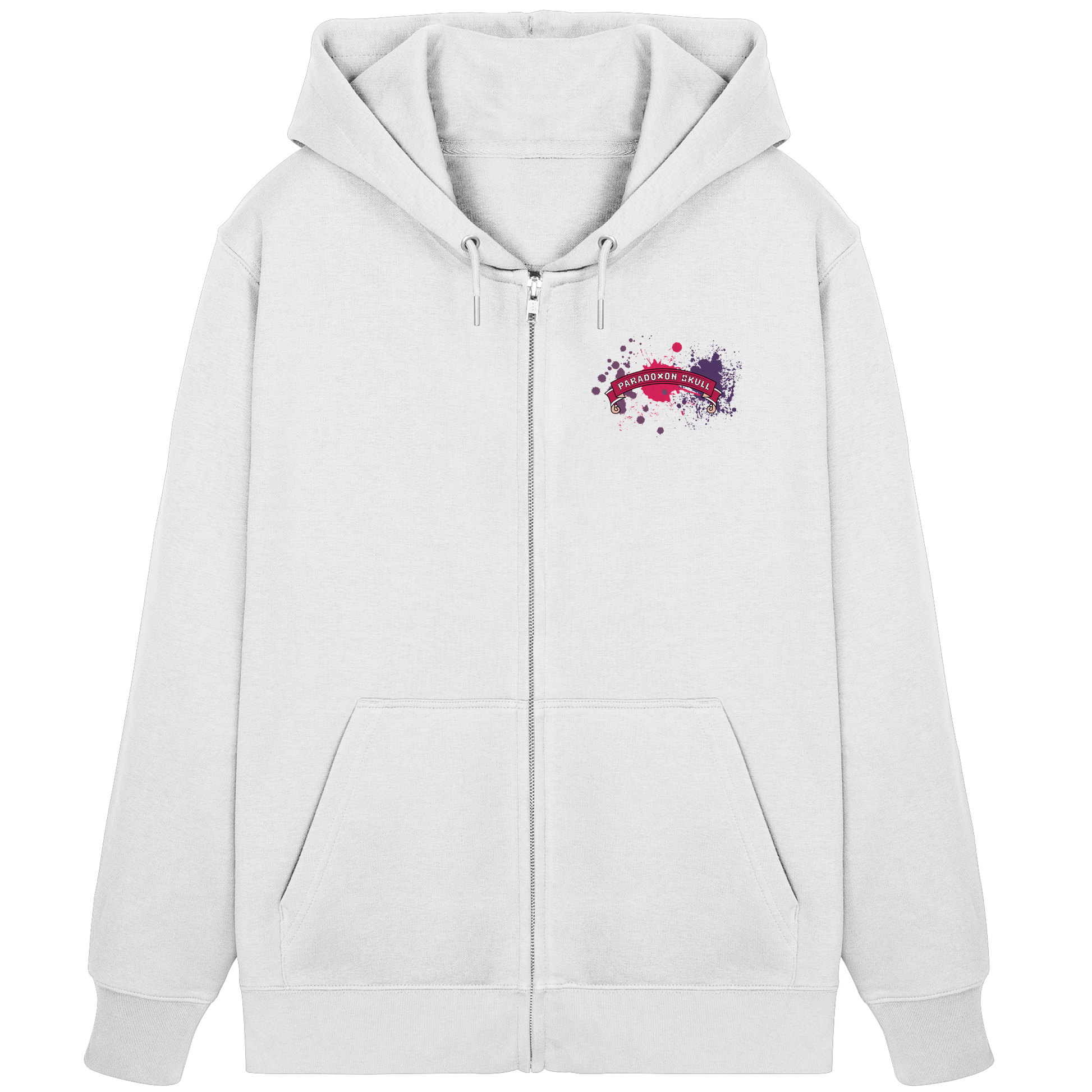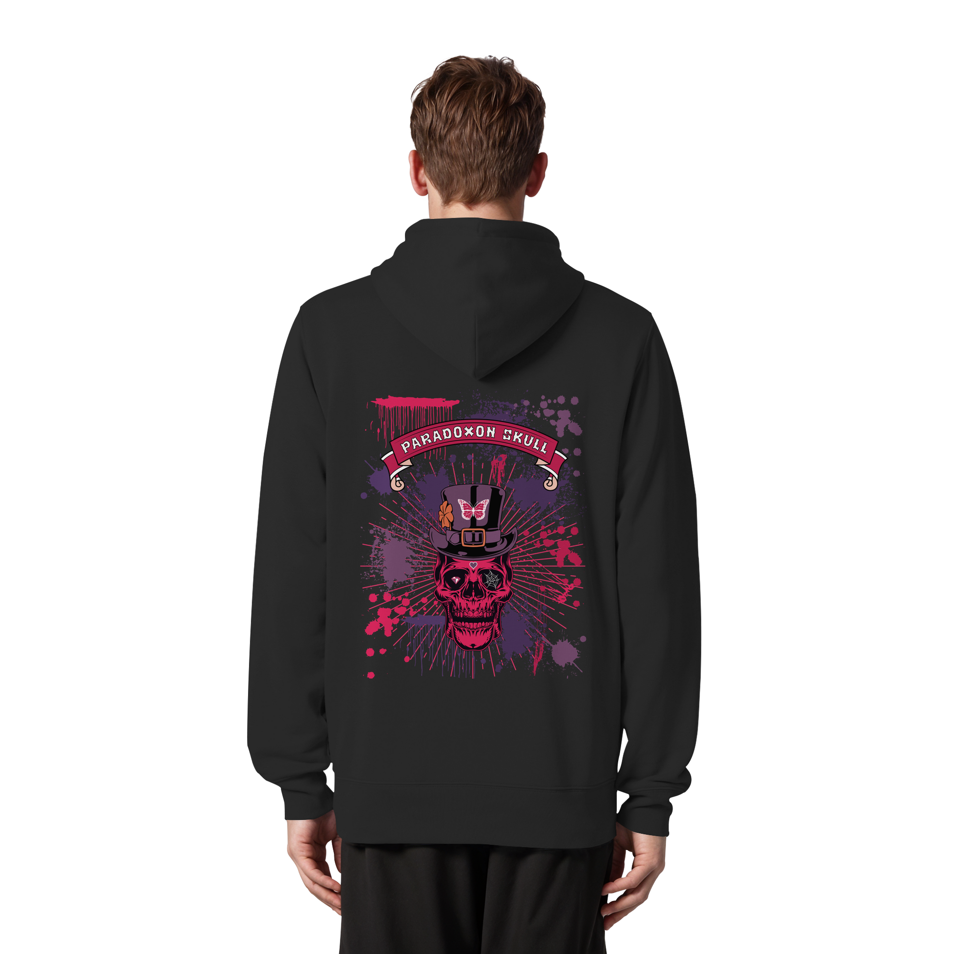 Das Leben zeigt sich als ein widersprüchliches Zusammenspiel von Vergänglichkeit und Schönheit, dargestellt durch den Totenkopf mit Zylinderhut und Schmetterling. Das Kleeblatt symbolisiert Hoffnung, der Diamant im rechten Auge steht für Reinheit, und das Spinnennetz im linken Auge verkörpert Komplexität. Das Herz auf der Stirn erinnert an die Liebe und Leidenschaft, die das Leben ausmachen.